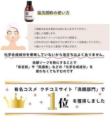 天然由来成分100%の石鹸素地とミネラル塩(マグマ塩)のみシンプルな配合。 パウダー状にすることで防腐剤不使用を可能し良い成分をより多く配合。 弱アルカリ性で、必要な水分や脂分はそのままに毛穴に詰まった汚れや皮脂汚れを優しく落としてくれるます。【 全成分 】 石ケン素地、マグマ塩(岩塩)(天然由来成分・合成着色料無着色・合成香料無香料・合成界面活性剤及び防腐剤不使用) 【 使用方法 】 適量を手に取り、水を含ませ優しく洗ってください。 岩塩が含まれているため、ざらつきが気になる場合はしっかり泡立てて優しくお顔にのせるようにし、擦りすぎないようにご注意ください。 泡立ちが悪く感じる場合がございます。