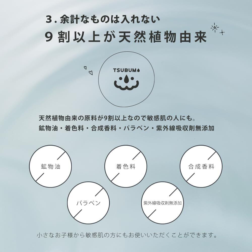 【5つの無添加】鉱物油不使用・パラベンフリー・着色料フリー・合成香料不使用・紫外線吸収剤無添加。余計なものは入れていません。つぶもは、これらの厳選成分を配合し、クリーミーなホイップ泡でお肌のツッパリ感を軽減しながら、油分を取り除きすぎることなく質の良い保湿によってダメージから守ります。