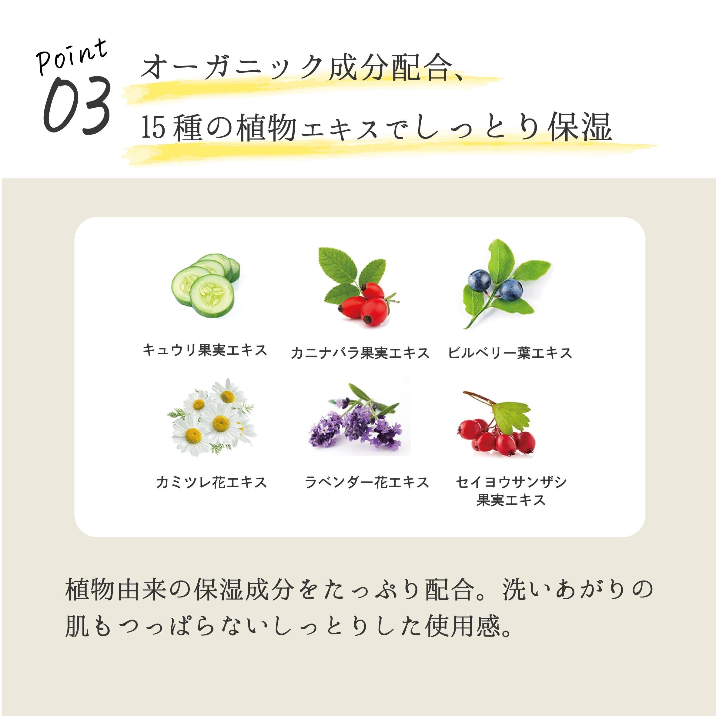 【15種の植物エキスが洗顔後のお肌をしっとり保湿】