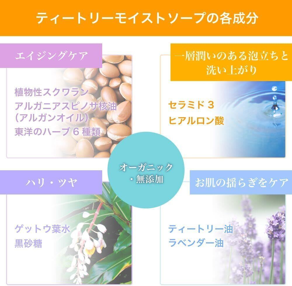 【ティートリーモイストソープの特徴】日本有数の石けん職人が、ひとつひとつ手作りの釜炊き枠練り製法で、約90日間かけて作り上げた無添加純石けんです。釜炊きと塩析(食塩を用いて石けん成分の純度を上げる自然な製法)を各2回繰り返すことで、より泡立ちが柔らかく豊かに、時間がたっても黄ばみにくい高品質に仕上げました。