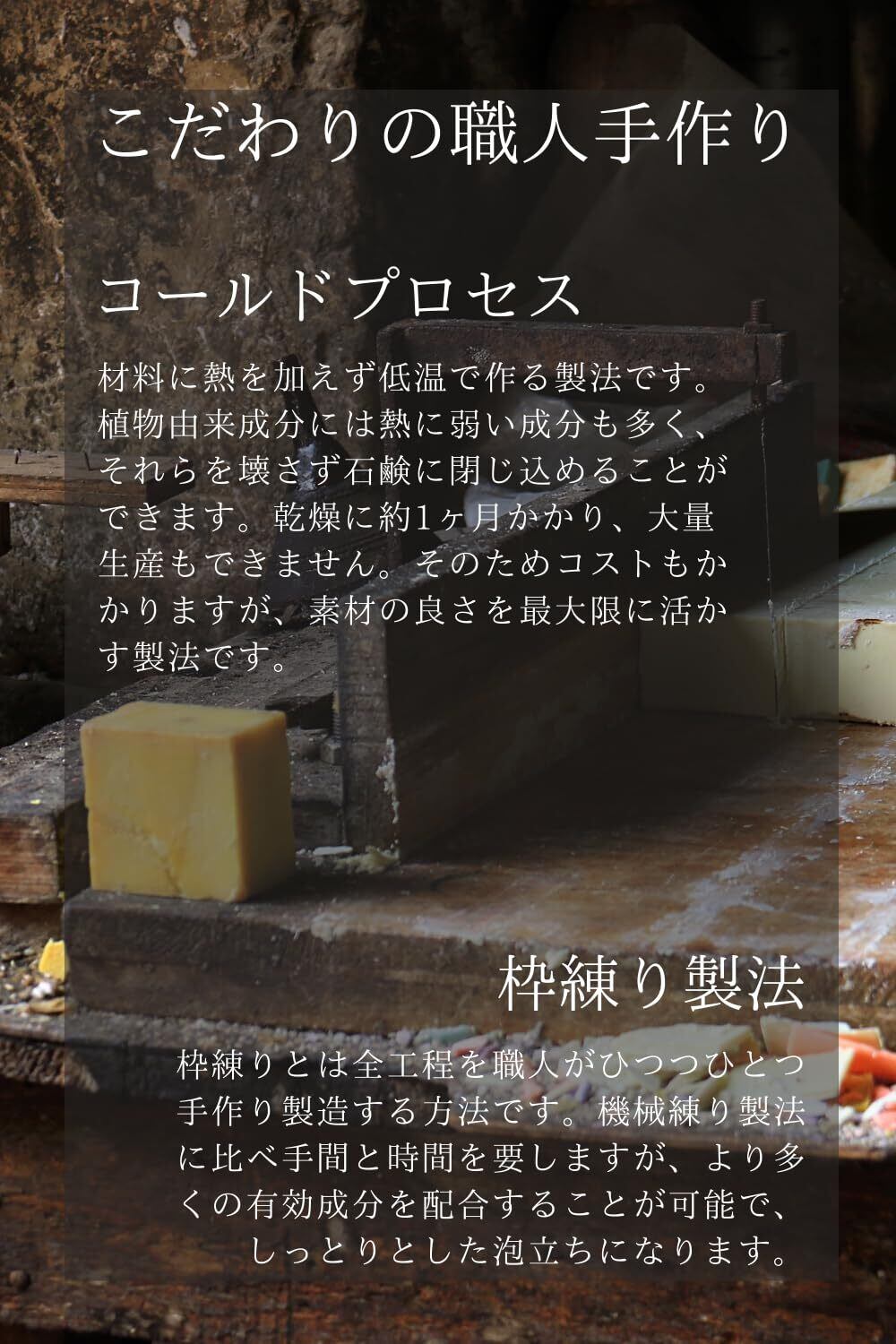 製法は職人が全工程手作りの枠練りコールドプレス製法。有効成分を壊すことなく凝縮しました。