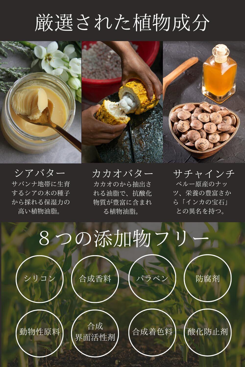 合成香料、酸化防止剤、防腐剤等の添加物や、石油由来原料および動物由来原料は一切しようしていません。