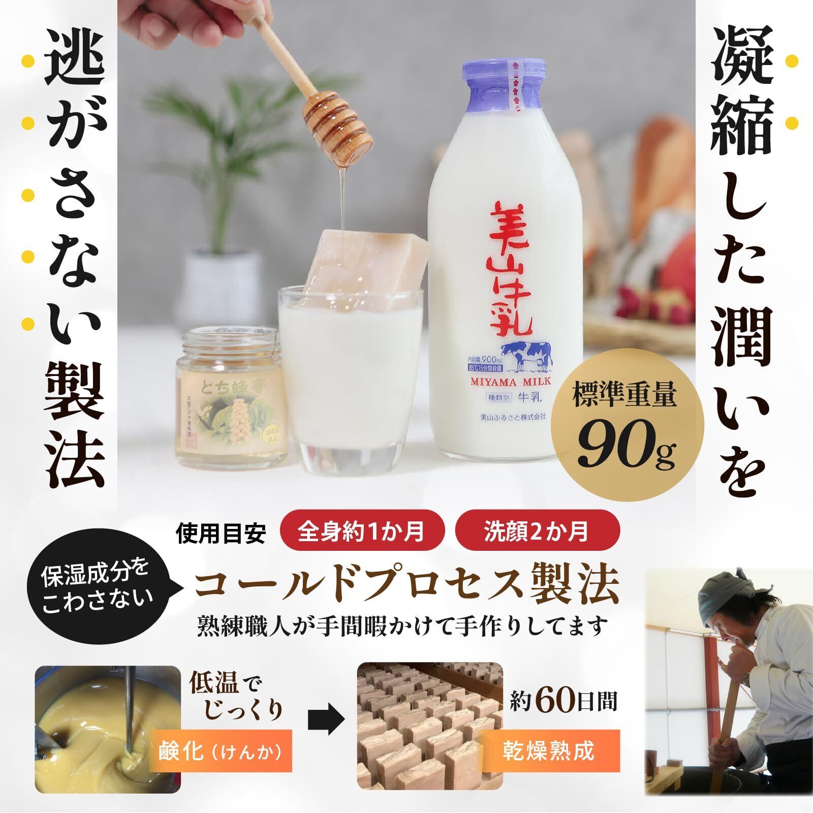 京都美山町の3つの特産素材をコールドプロセス製法で、低温で鹸化し、約60日間乾燥熟成した手作り石鹸です。 [3つの特産素材] 美山町の特産牛乳「美山牛乳」と同じ生乳からチーズの製造工程でできる「美山乳清」、そこに「とちハチミツ」を加えました。 蜜源花の開花に合わせて巣箱を移動させる『転飼養蜂(てんしようほう)』で採取された貴重な無添加・無加工・非濃縮の蜂蜜です。 希少価値が高く、贅沢な逸品に仕上がりました。 美山町の自然の恵みが凝縮されたうるおいをぜひ体感してください。