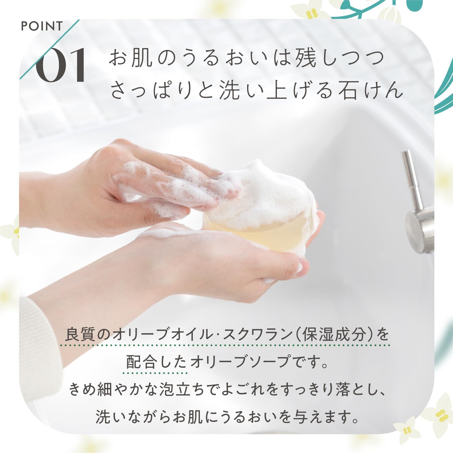 良質のオリーブオイルとスクワラン(保湿成分)を配合したオリーブソープです。きめ細やかな泡立ちでよごれをすっきり落とし、洗いながらお肌にうるおいを与えます。
