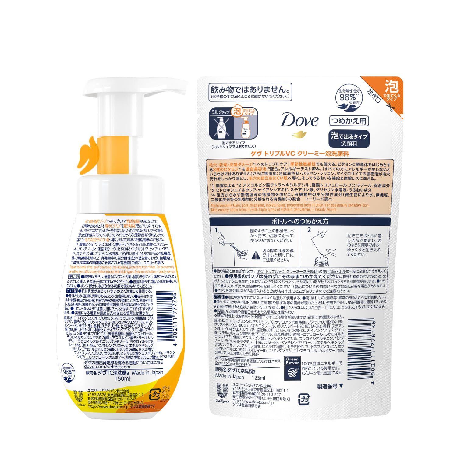 Dove(ダヴ) フェイス 洗顔 Dove フェイスケア 泡洗顔 クリーミー泡洗顔料 トリプルVC 本体+詰め替え 150ml+125ml ビタミン 毛穴汚れ