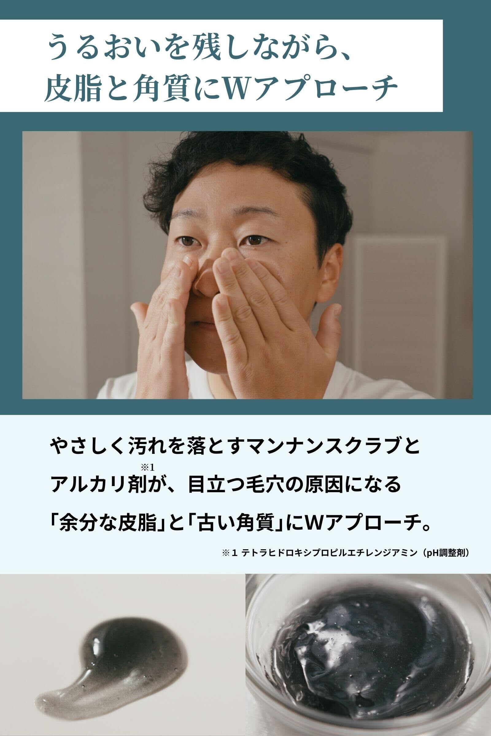 ②【黒いスクラブ洗顔ジェル】 こんにゃく由来のやさしい使い心地のスクラブ入りで洗顔すると皮脂や角栓もスッキリします。泡立てる面倒な作業も必要なし。ジェル状なので男性の場合はヒゲ剃りも同時に。