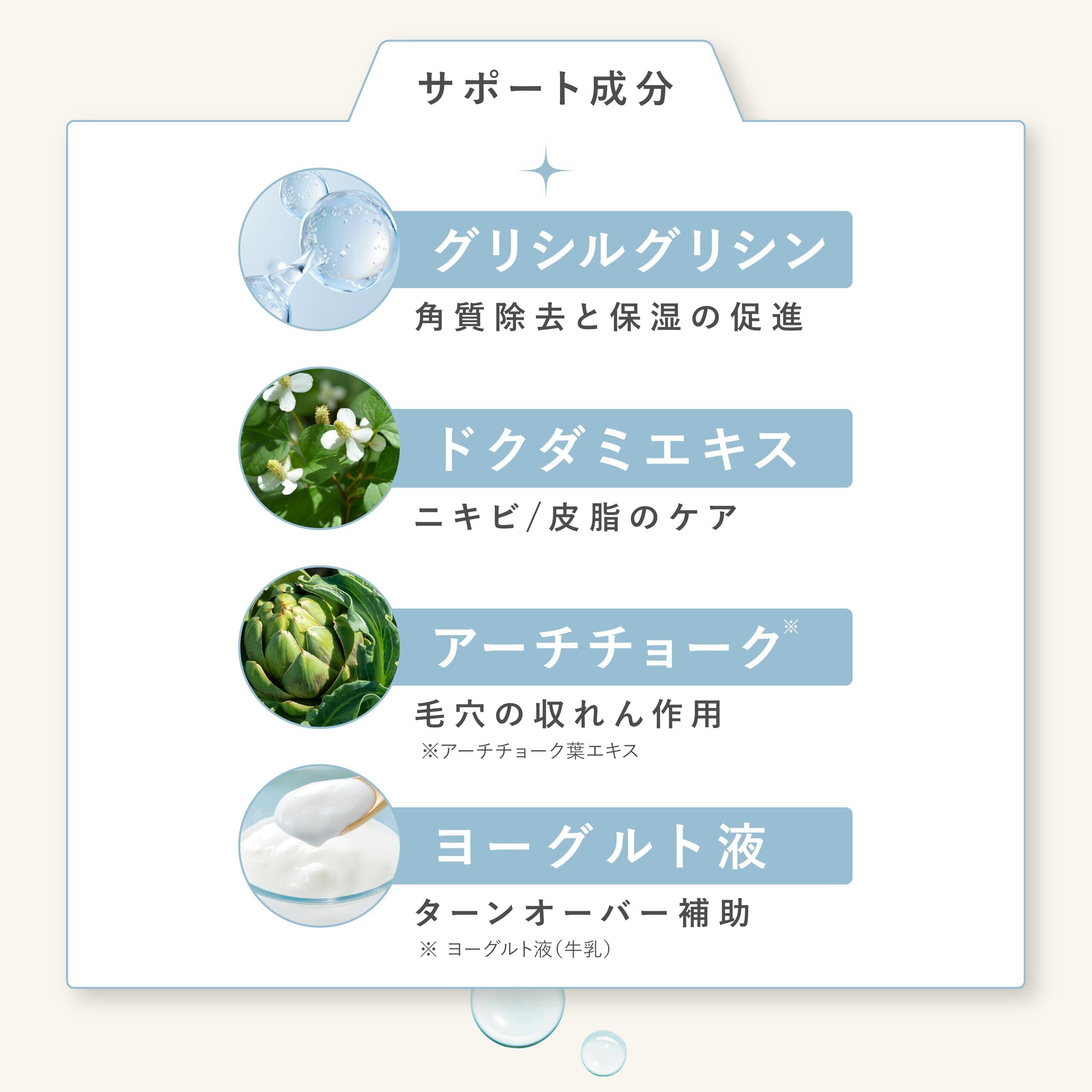 水、グリセリン、DPG、カリ石ケン素地、ラウリルヒドロキシスルタイン、ラウラミドプロピルベタイン、PG、PEG-40水添ヒマシ油、アゼライン酸、グルコノラクトン、グリチルリチン酸2K、ヨーグルト液 (牛乳)、 加水分解コラーゲン、ヒアルロン酸Na、ポリグルタミン酸、グリシルグリシン、グルタチオン、セラミドNP、セラミドAP、グアイアズレン、ツボクサエキス、ドクダミエキス、チャ葉エキス、オウゴン根エキス、カンゾウ根エキス、カミツレ花エキス、イタドリ根エキス、ローズマリー葉エキス、アーチチョーク葉エキス、乳酸桿菌/ハス種子発酵液、プルーン分解物、キウイエキス、ダイズ種子エキス、ダイズタンパク、BG、エチルヘキシルグリセリン、カプリル酸グリセリル、コカミドメチルMEA、コカミドDEA、カプリン酸グリセリル、ラウリン酸ポリグリセリル-2、ラウリン酸ポリグリセリル-10、エタノール、トコフェロール、塩化Na、クエン酸、フェノキシエタノール、メントール、ティーツリー葉油、ローズマリー葉油、セイヨウハッカ油、香料、青1