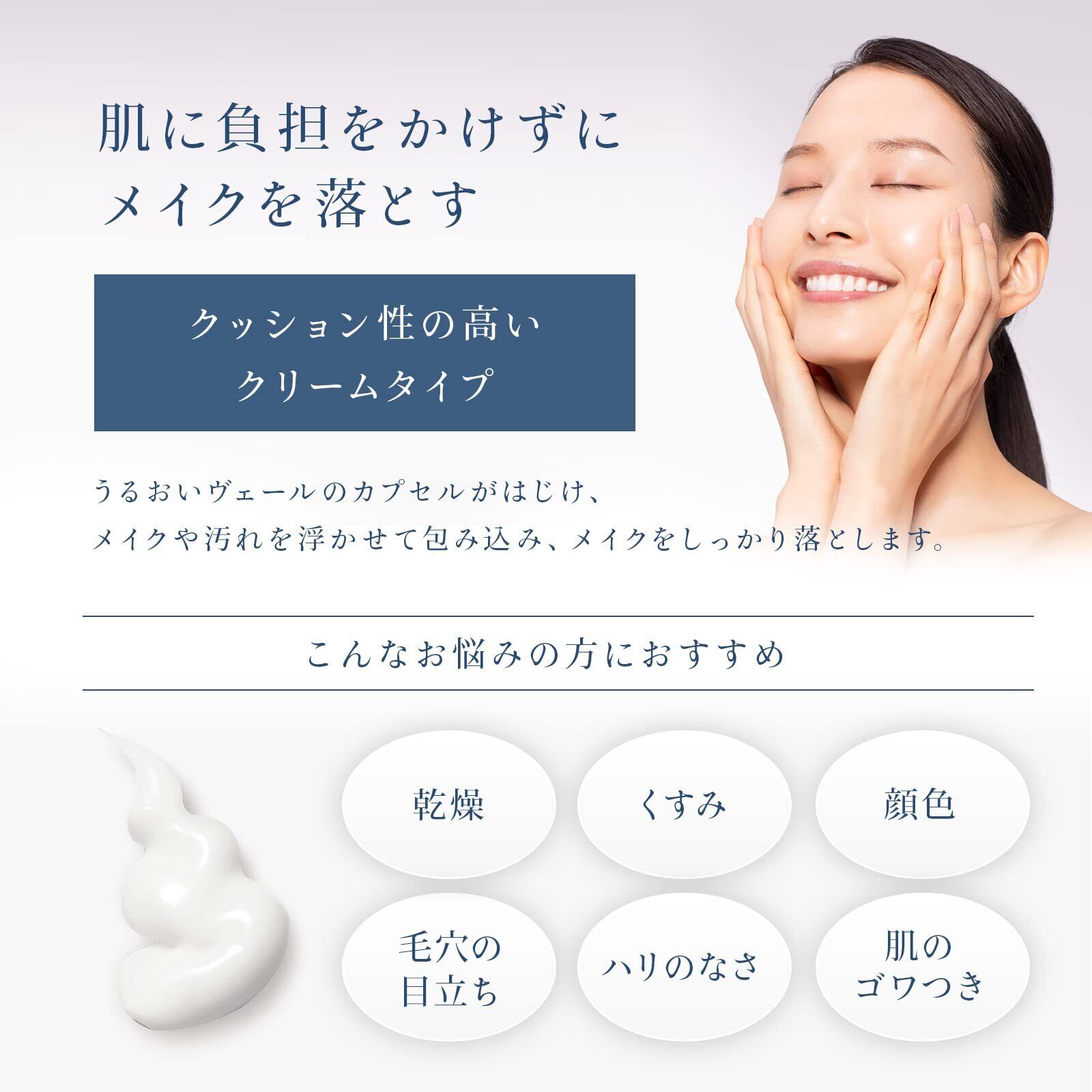 【肌に負担をかけないメイク落とし】うるおいヴェールのカプセルがはじけ、メイクや汚れを浮かせて包み込み、メイクをしっかり落とします。クッション性の高いクリームタイプでやさしい肌あたり、軽くなめらかなタッチでなじみ、後肌もベタつきません。