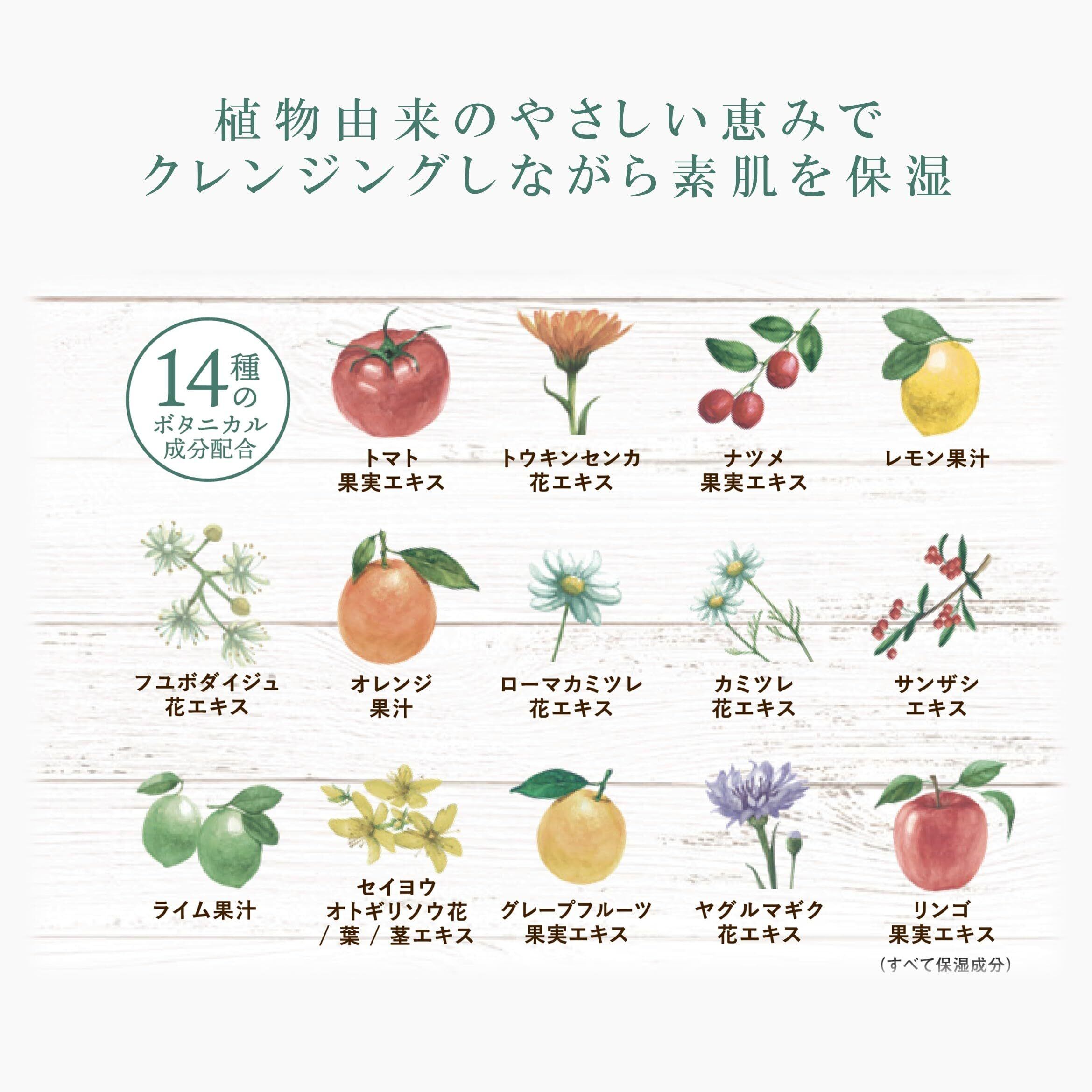 ボタニカルマルシェは、「肌質」「肌の悩み」「メイクの濃さ」など、ご自身のお肌の状態によってお選びいただけます。独自のバランスで配合したボタニカルエキスと美肌成分が、メイクや毛穴の汚れを洗い落としながら肌にうるおいを与え、精油をブレンドした自然な香りが心身を癒すように広がります。素肌へ。植物の恵みを。