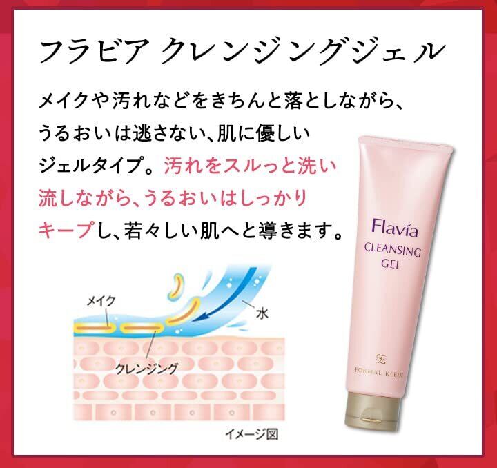 【使用方法】クレンジングジェルは手と顔が乾いた状態でお使いください。さくらんぼ粒大を目安に手に取り、メイクとやさしくなじませ、十分に洗い流してください。その後、フラビアソープを泡立てネットでしっかり泡立たせ、やさしく顔全体を洗い、しっかり洗い流してください。