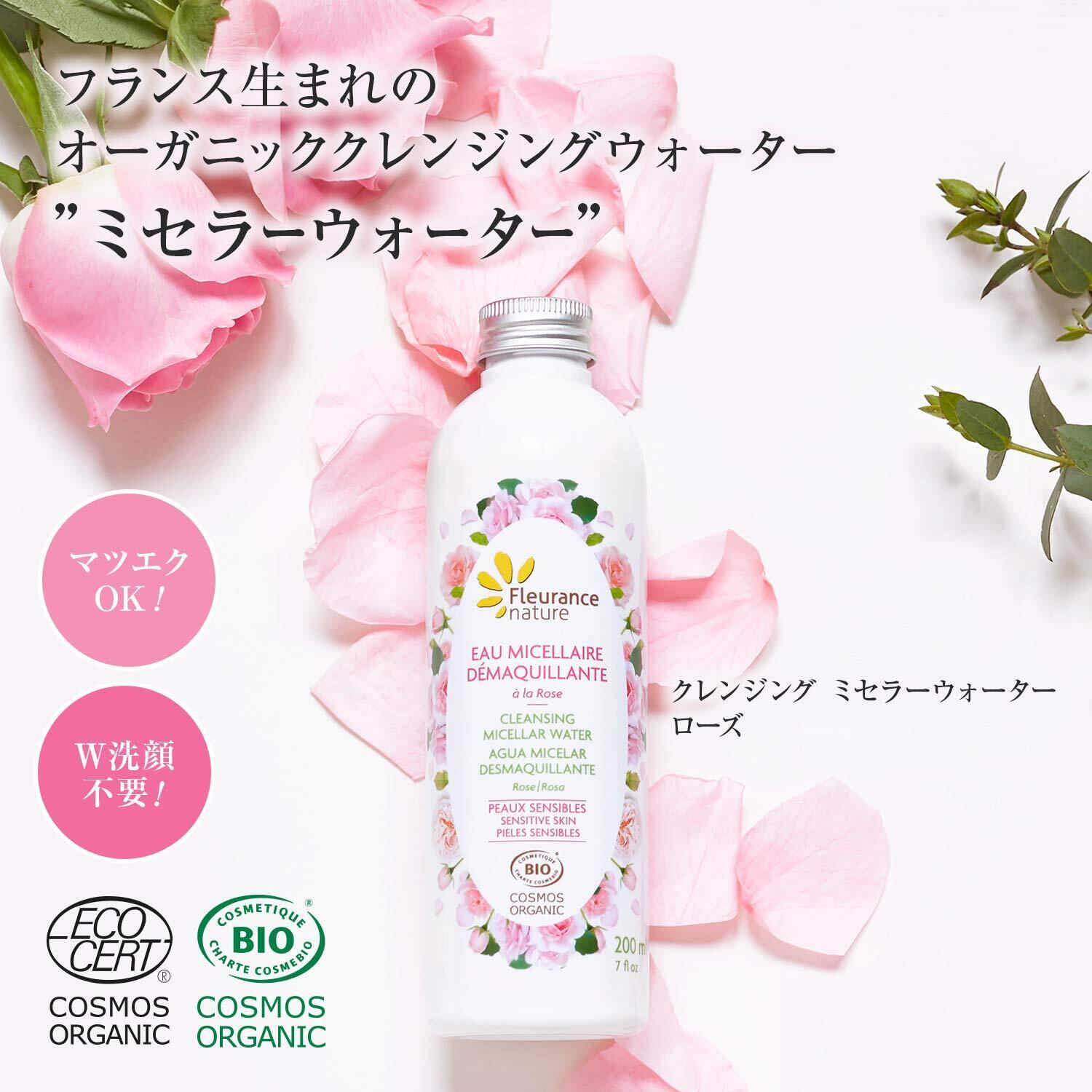 フルーランスナチュール オーガニック ミセラーウォーター ローズ/天然由来成分 99 % < 美容成分配合のメイク落とし > クレンジングウォーター ふき取りタイプ (オイルフリー) (200ml)