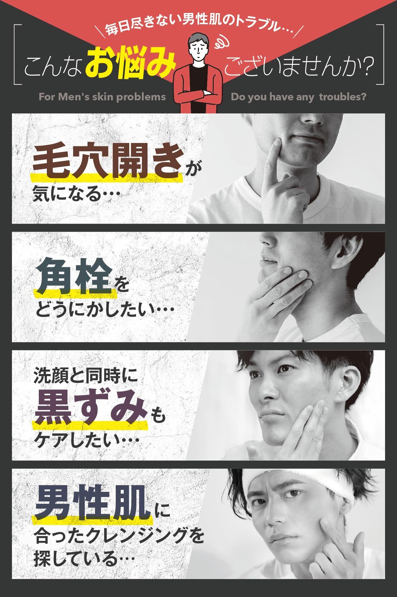 【普段お化粧をしない男性にも】普段お化粧をする男性はもちろん、お化粧をしない男性にも洗顔としてお使いいただくとお肌にハリ・ツヤを与えて毛穴や黒ずみにアプローチすることができるのでオススメです。W洗顔不要でこれ1つでOK。