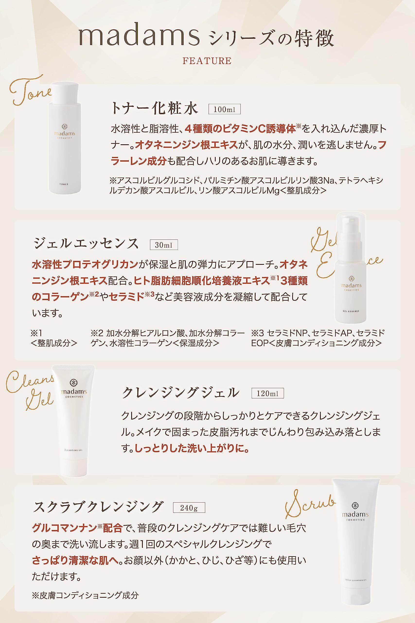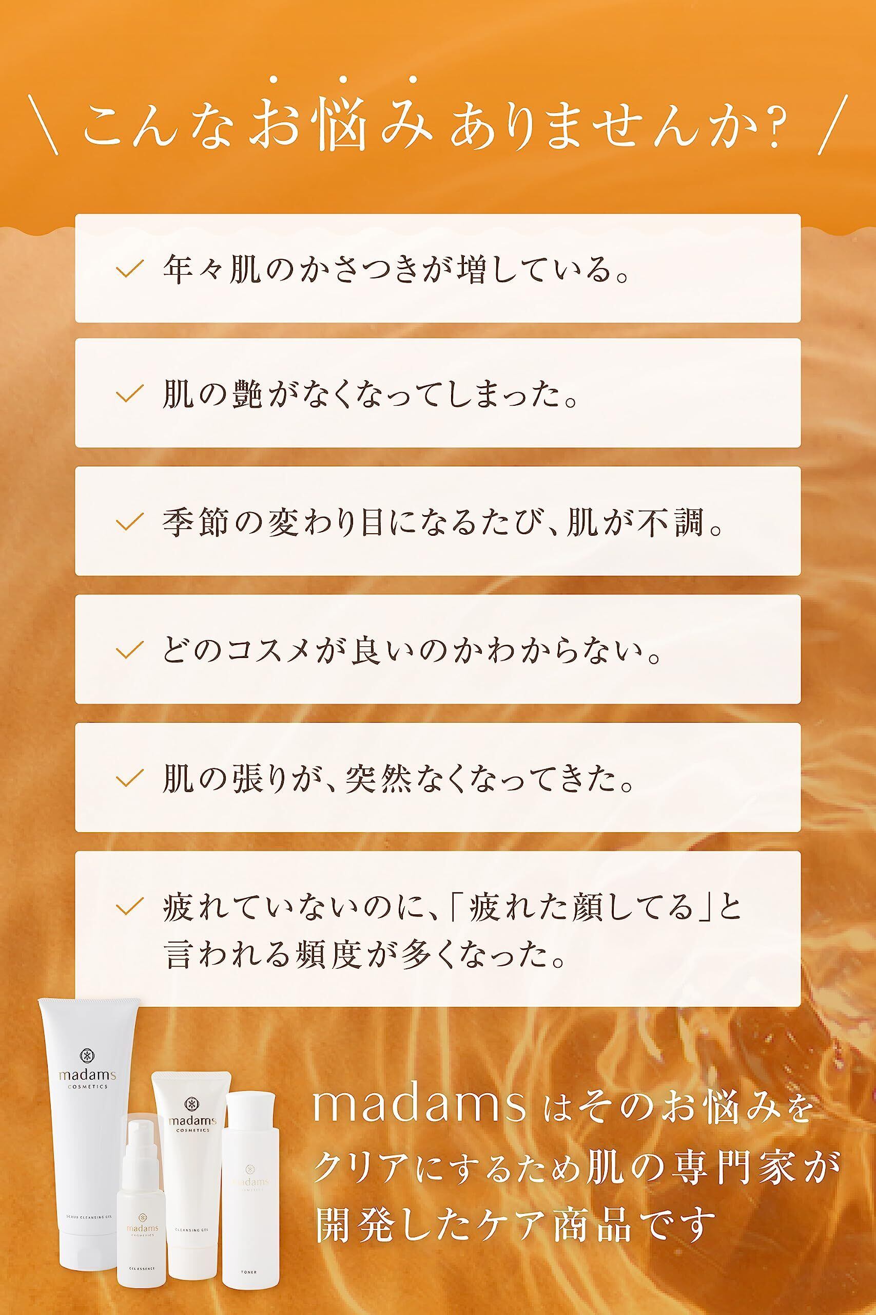 【エイジングケア】マダムスは本当に必要な成分だけをぎゅっと詰め込み、30代、40代の年齢肌にうるおい・ハリ・弾力を与え若々しい肌へ導きます。