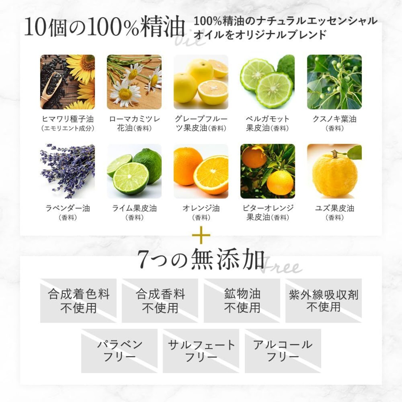 7種の無添加と10種の100%精油で肌を整え、いい香りであなたの心を包みます。