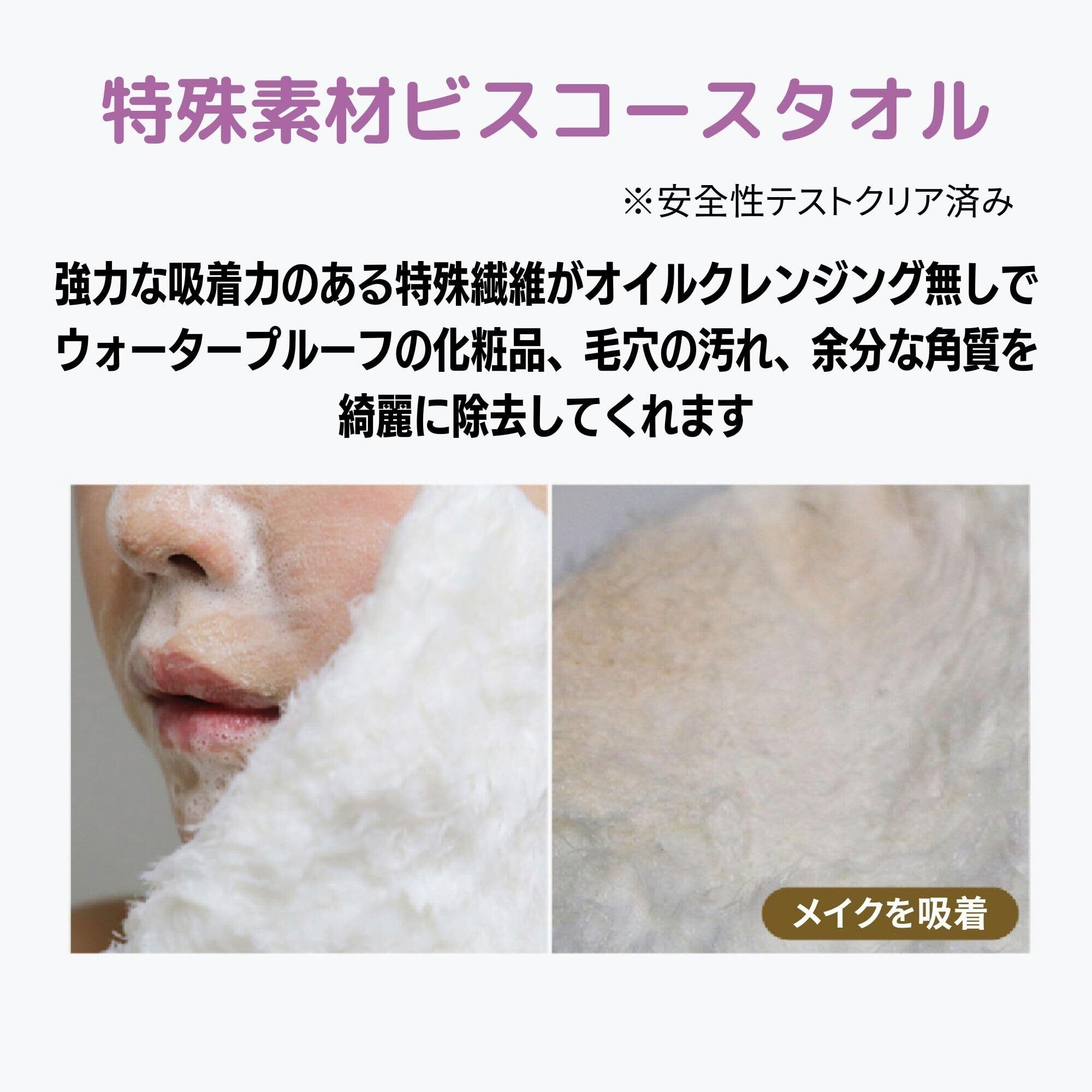 [製品紹介] ●韓国で開発されたディープクレンジングタオルは、独自開発の「マイクロプラスフィルター構造」が優れた吸着力により、肌表面の不要な角質、メイクアップなどの油分をスッキリと除去することができます。 ●繊維の構造により抗菌および消臭効果99.9%(臨床データ有り)を実現しているため、バスルームなどの多湿環境においても菌の増殖を抑えます。 ●肌への安全性について、ダーマテスト(ドイツ皮膚専門科学研究所)「エクセレント」評価、韓国の試験研究機関の「KCマーク」を取得して高評価を得ています。