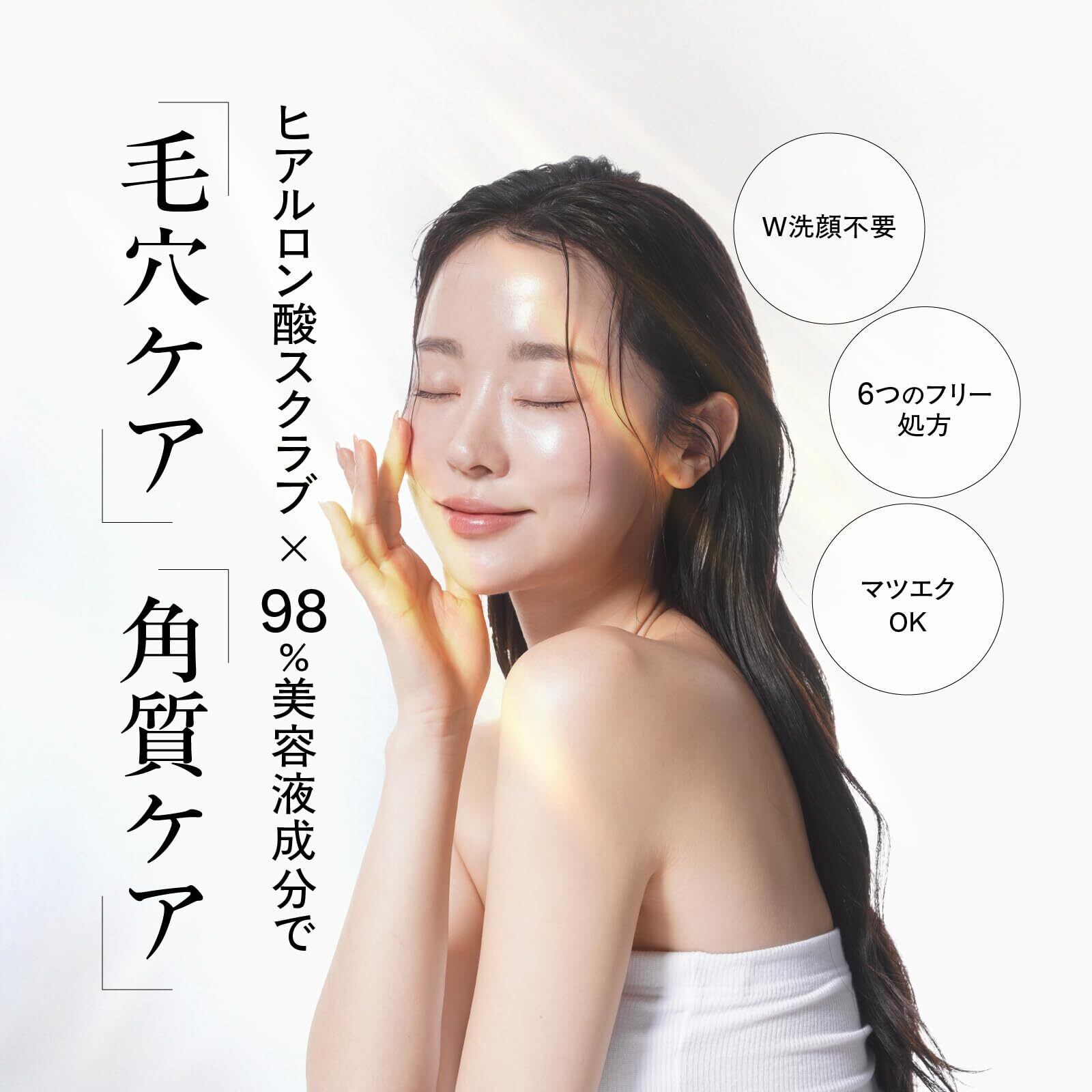 カプセルスクラブが毛穴やシワに入り込み溜まった汚れを密着、洗浄します。 重ね塗りメイクも落ちる洗浄力。 スクラブがお肌をやさしくピーリングしツルツルのお肌へ導く。 ビタミンCとビタミンC誘導体配合でメイクオフした後の毛穴詰まり、黒ずみ、開きにもアプ ローチ。 人気の美容保湿成分も同時配合(レチノール/ アーティチョーク葉エキス/ グリチルリチン 酸2K / ナイアシンアミド/ セラミド/ CICA / コラーゲン/ ヒアルロン酸/ フラーレン等)。 メイク落とし、W洗顔不要、毛穴ケア、肌荒れ予防、角質ケア、くすみケア、保湿の7in1