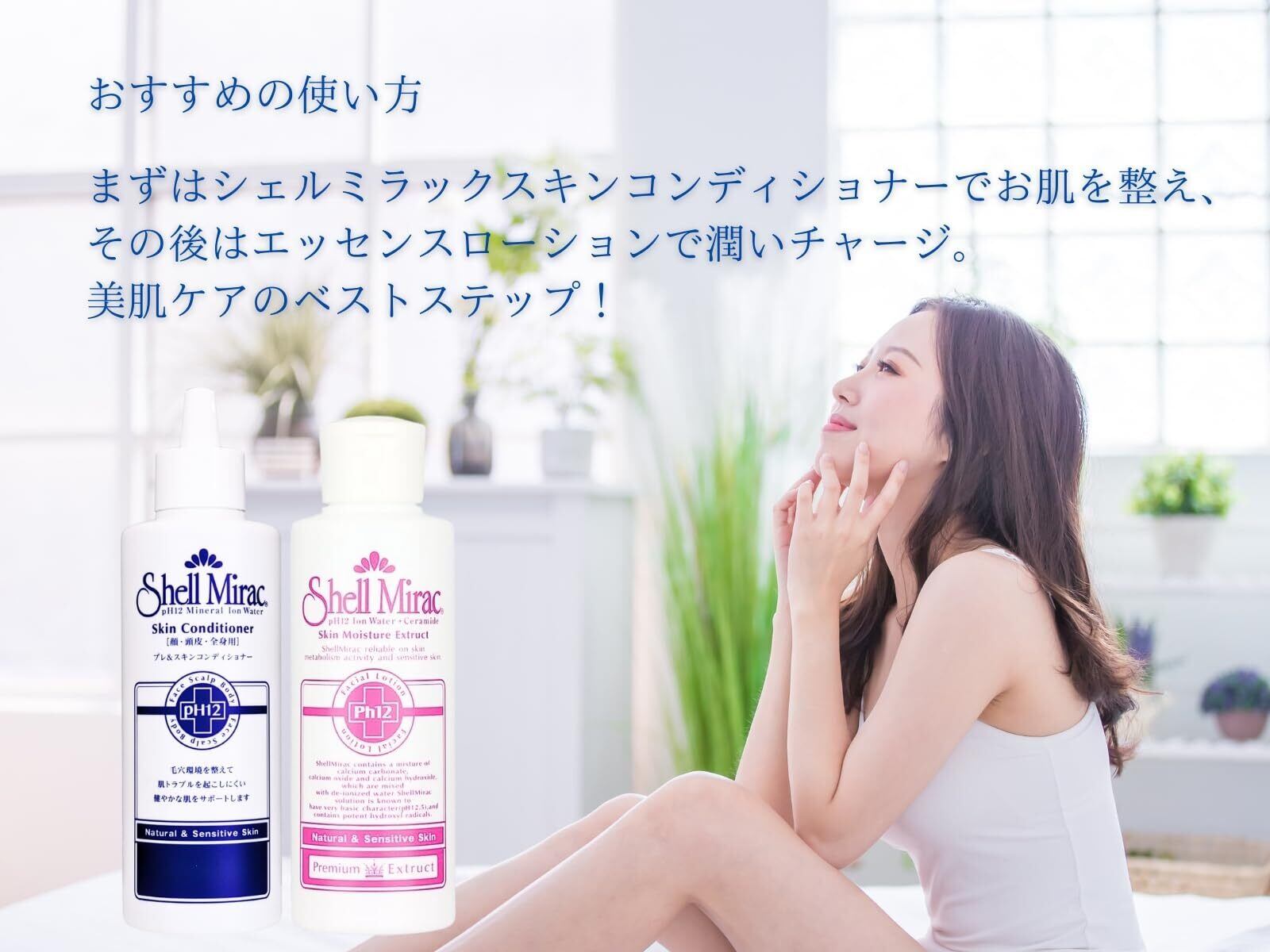 ホタテ貝殻由来の全身用のアルカリイオン水「シェルミラックスキンコンディショナー」に、美容成分『セラミド(こんにゃくセラミド)』や保湿成分を配合し、保湿力と美肌力をアップさせた化粧水です。