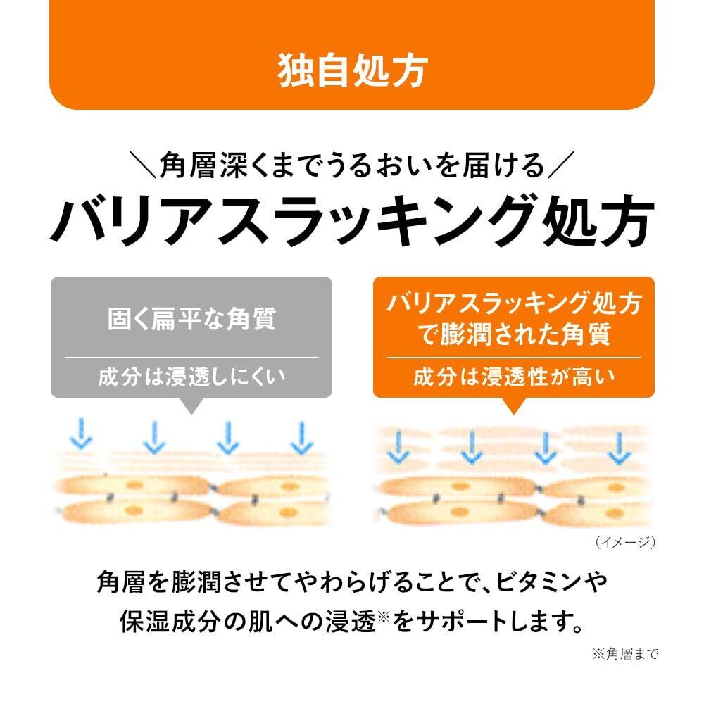 \独自の「バリアスラッキング処方」採用/肌の奥※までうるおい、ビタミンを届ける。濃密なローションを肌にのせた瞬間、とろりパシャと素早く浸透 ※ 。 肌の角層を膨潤させてやわらげ、瞬時にアプローチし、ツヤのある肌へ。※角層まで