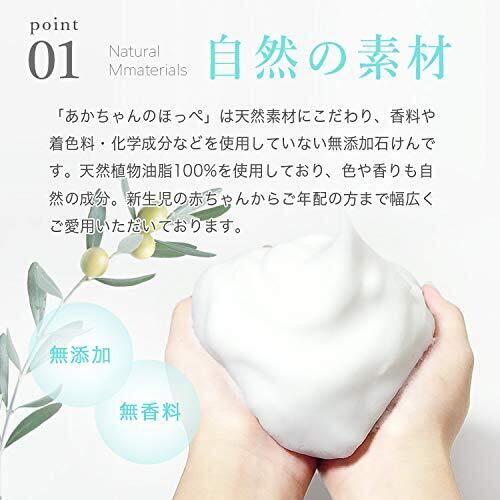 「あかちゃんのほっぺ」石けんは、天然原料にこだわり、香料や着色料・化学成分を一切使用しない無添加せっけんです。 天然植物油脂を100%使用しており、色や香りも自然の成分。ちゃんと汚れは落としながら必要な油分は残し、「あかちゃんの肌」のようにしっとりと潤い、すべすべに。 お肌にトラブルがある方には、特に手離せない石けんとして、大変喜ばれています。新生児からご年配の方まで幅広くご愛用いただいております。 成分:石けん素地100% 重量:固形100g(1個あたり)