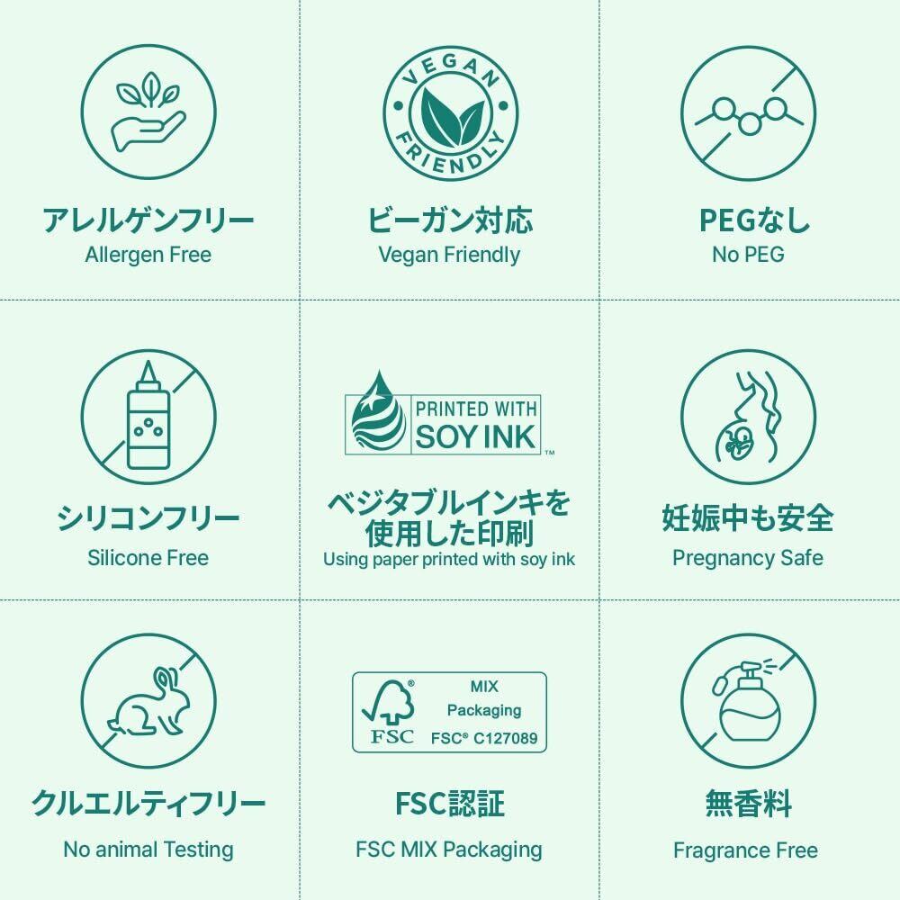 【低刺激フォーミュラ 】 シリコン Free、PEG Free、フタル酸エステル Free、香料 Free、アルコール Free、アレルギー Free、パラベン Free、ミネラルオイル Freeで安心してお使いいただけます。