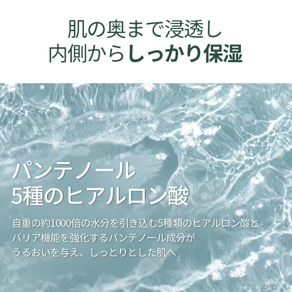 【配合成分の特徴】 バンブーエキス、ツボクサエキス、ティーツリー、パンテノール、5種のヒアルロン酸が肌にうるおいを与え、すこやかな肌状態をサポートします。