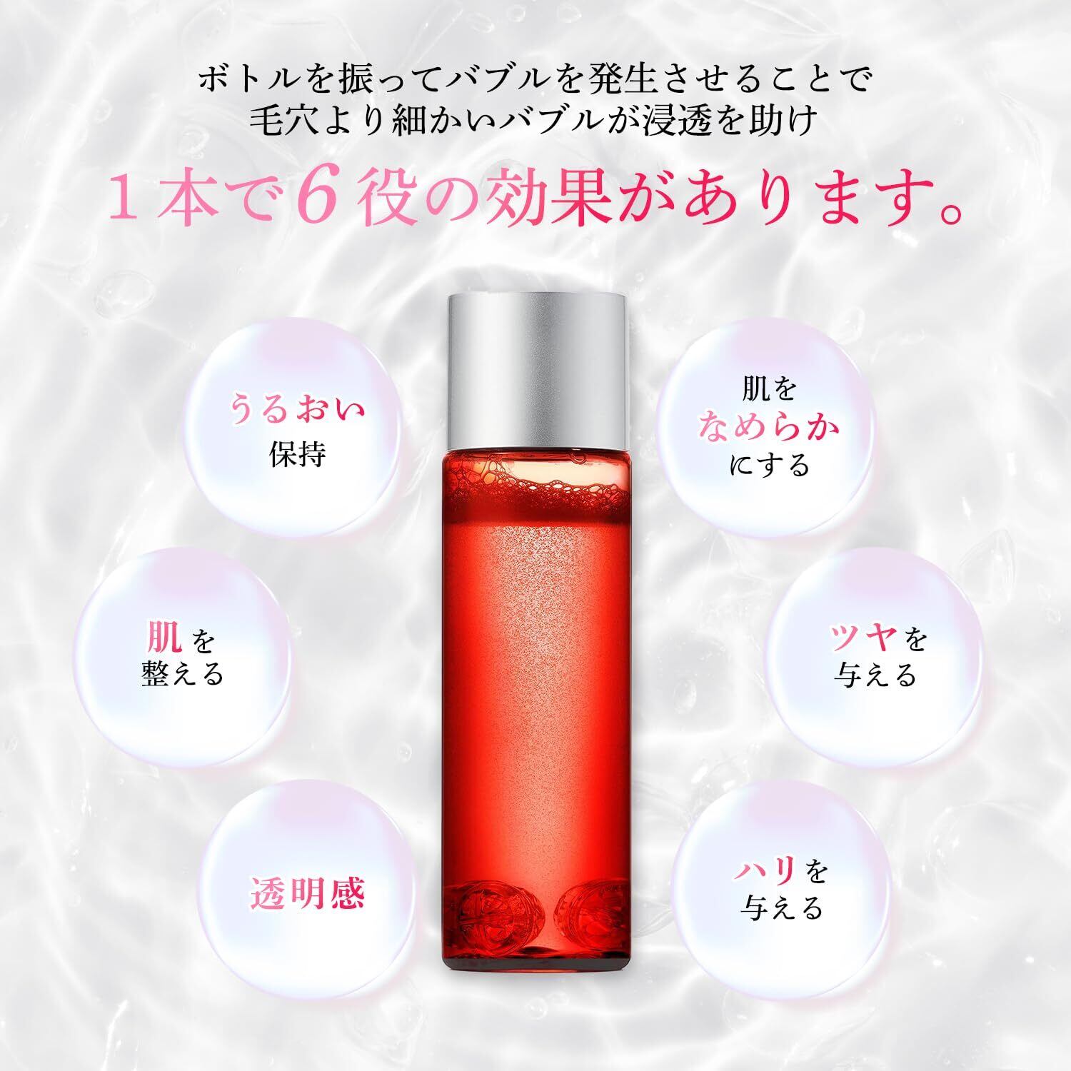 【1本で6役】マテラの化粧水は振ってバブルを発生させることで、毛穴より細かいバブルが浸透を助け、1本で6役の効果があります。(うるおい保持・肌をなめらかにする・ツヤを与える・ハリを与える・透明感・肌を整える)