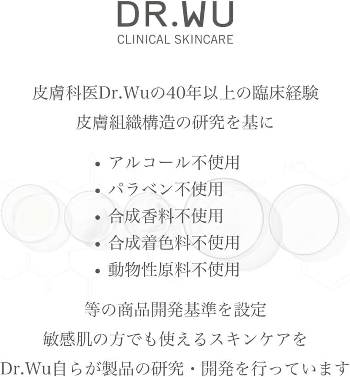 【台湾No.1ドクターズコスメブランド「DR.WU」】 「DR.WU」は、皮膚科医 英俊(Dr. Ying-Chin Wu)が2003年に設立した、台湾を代表するスキンケアブランドです。40年以上の臨床経験と研究を踏まえ、香料・着色料無添加、アルコールフリー、パラベンフリー、動物性原料不使用で、敏感肌に配慮した製品を開発しています。高機能で使いやすいスキンケアアイテムを提供し、多くのサポートを集めています。