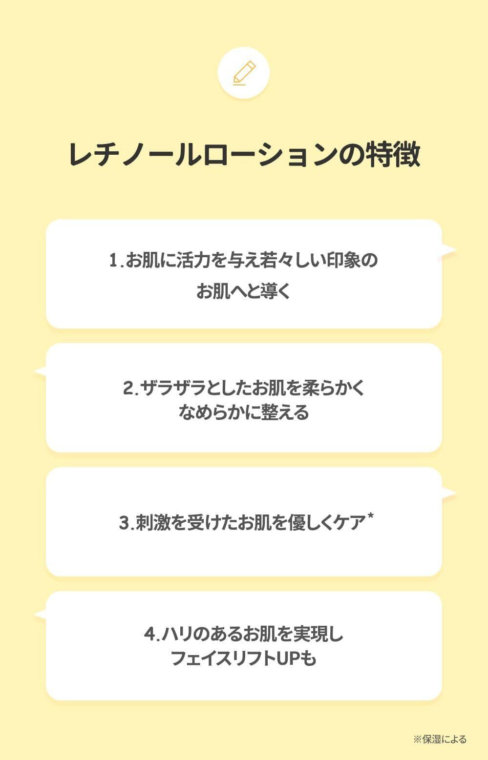 初めての方でも安心して使用できるよう、レチノールは肌への刺激を最大限に抑えた配合量。 ローションはとろとろテクスチャーで伸びが良くしっとりとした潤いを与えます。肌のハリや毛穴が気になる方に。