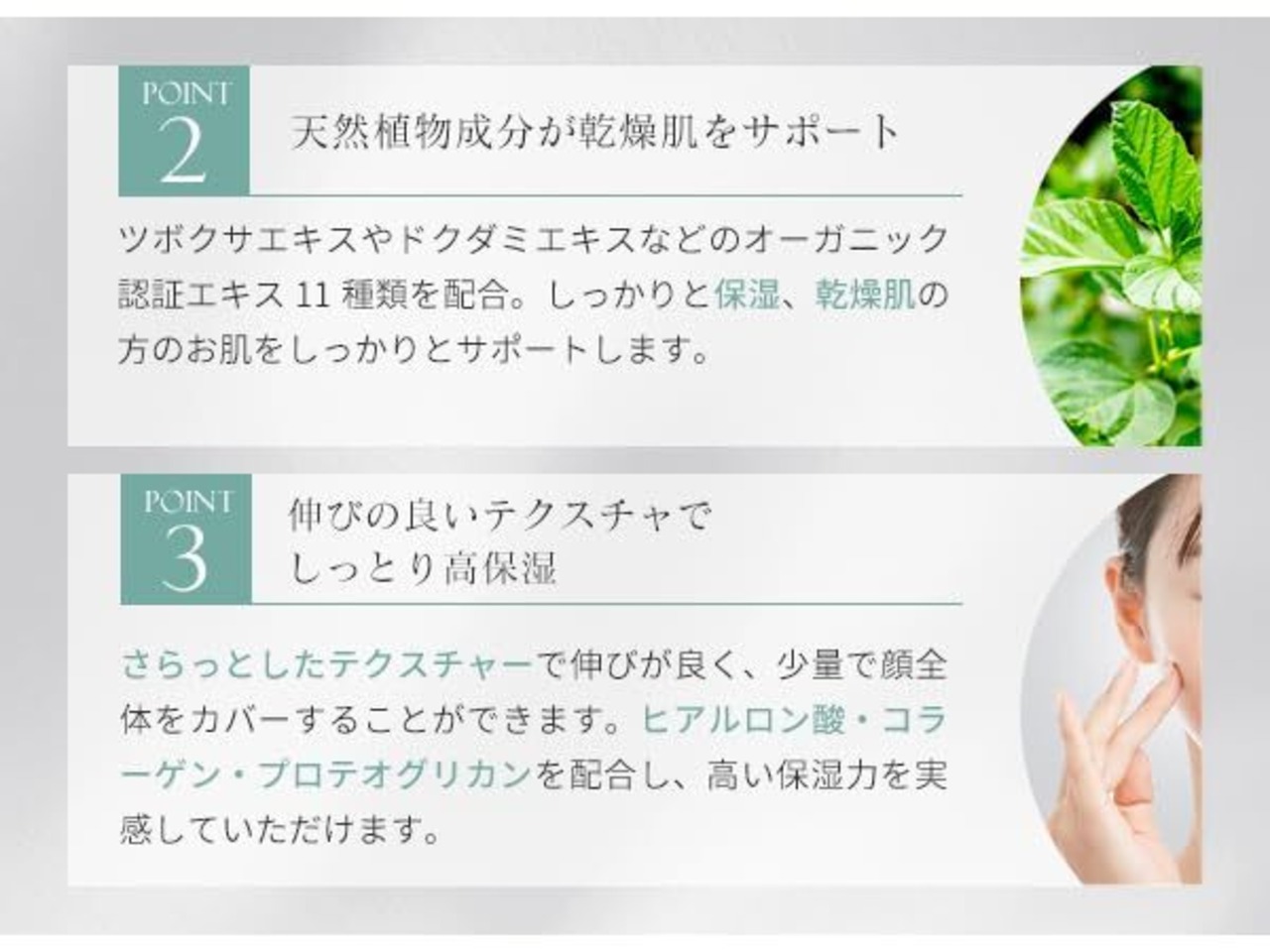 【乾燥肌の方でも使える10種類のオーガニックエキス配合】10種類の天然植物成分がお肌をサポートするので乾燥肌の方でもお使いいただけます。〈カンゾウ根エキス・オウゴン根エキス・ツボクサエキス・ローズマリー葉エキス・かみつれ花エキス・チャ葉エキス・イタドリ根エキス・ドクダミエキス・ヨモギ葉エキス・ユズ果実エキス〉