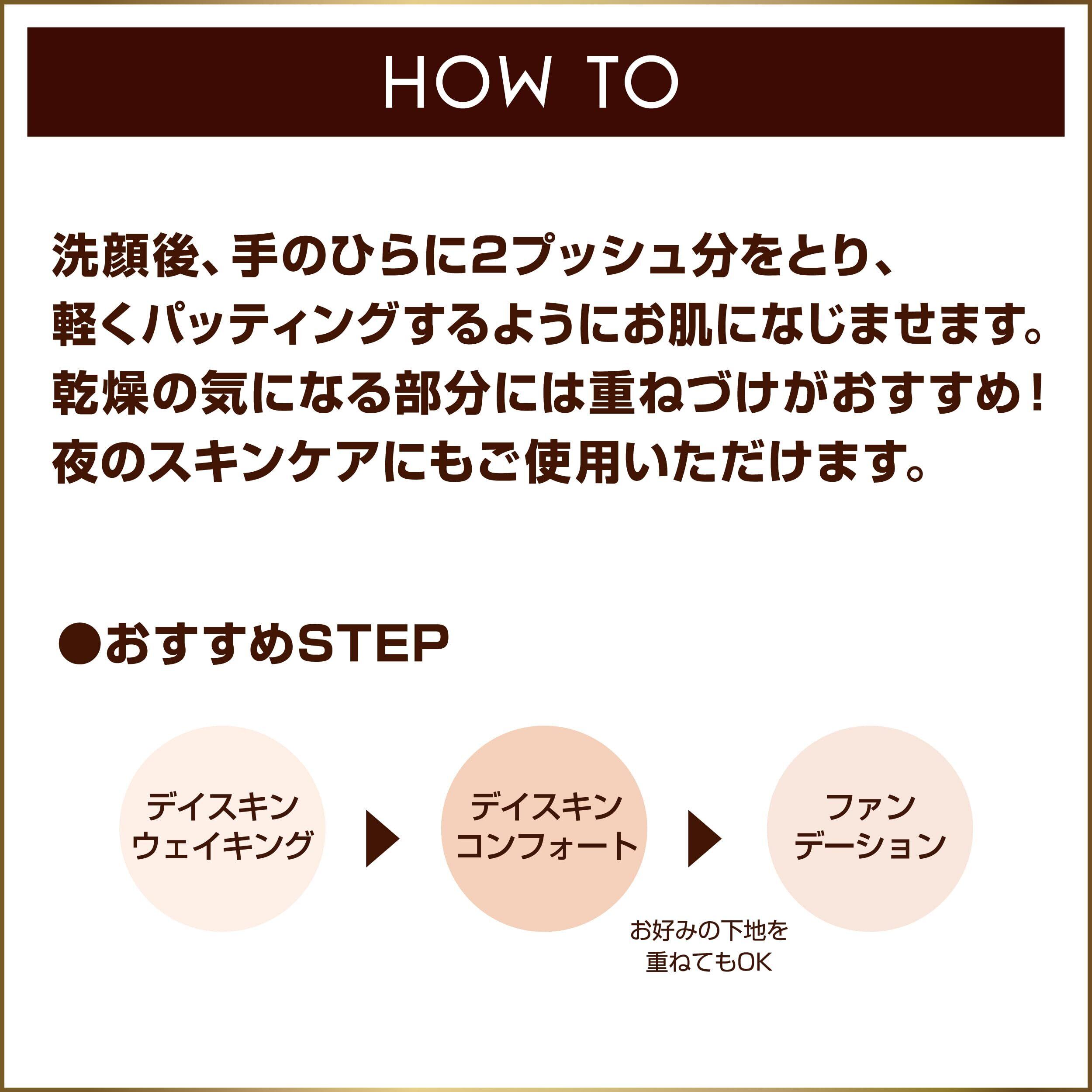 <ご使用法> 洗顔後、手のひらに2プッシュ分をとり、軽くパッティングするようにお肌になじませてください。乾燥の気になる部分には重ねづけをおすすめします。 ○夜のスキンケアにもご使用いただけます。
