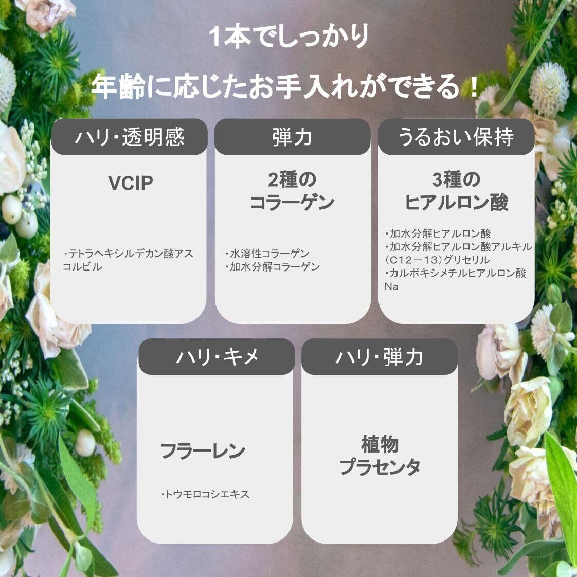 有効成分 ビタミンC、コラーゲン、ヒアルロン酸、エラスチン、和漢植物、フラーレン、美肌菌、カンゾウエキス