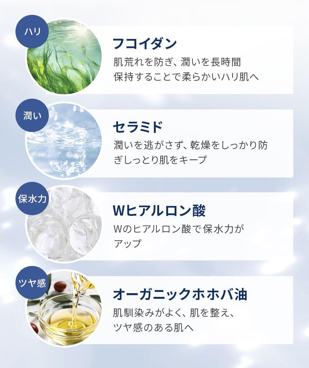 毛穴・シミ・くすみ、さらにシワまでしっかりカバー。フコイダン・オーガニックホホバ油・Wヒアルロン酸・セラミド配合でツヤ感・ハリ感・潤いをアップ!
