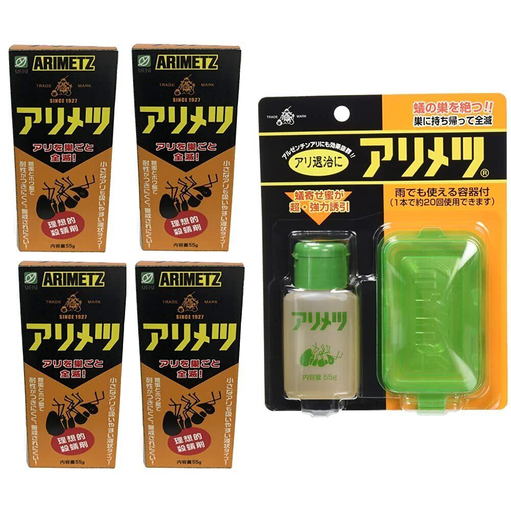 アリメツはアリの生活状態と習性を永年研究した結果生まれた殺蟻剤です。 一匹のアリが本剤を発見すると仲間を呼んで一時にアリメツに集中吸食し、 餌として巣の中に運ばれ貯蔵し、女王アリをはじめとする巣全体のアリが食べる事により、 巣の仲間を時間の経過と共に全滅させます。