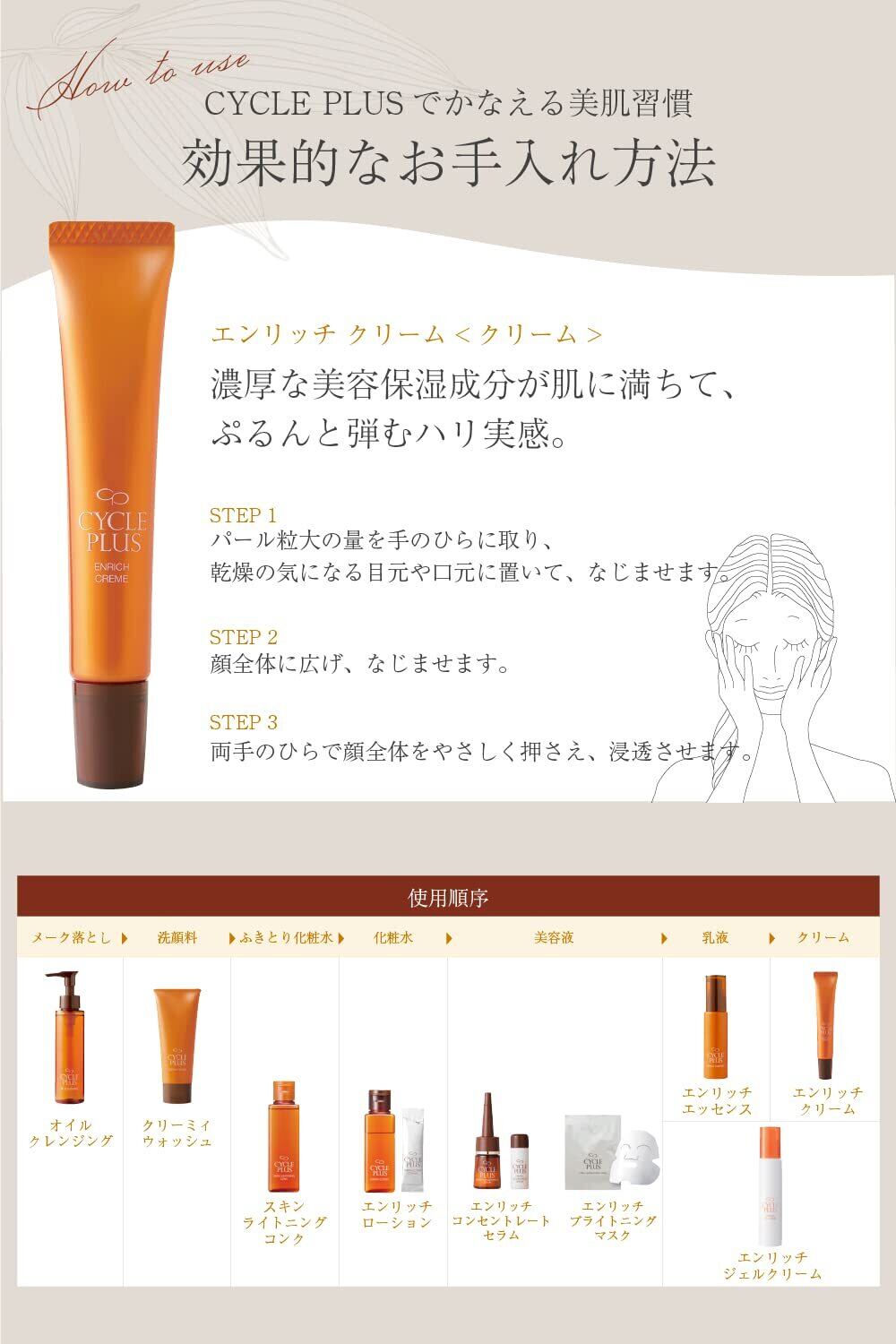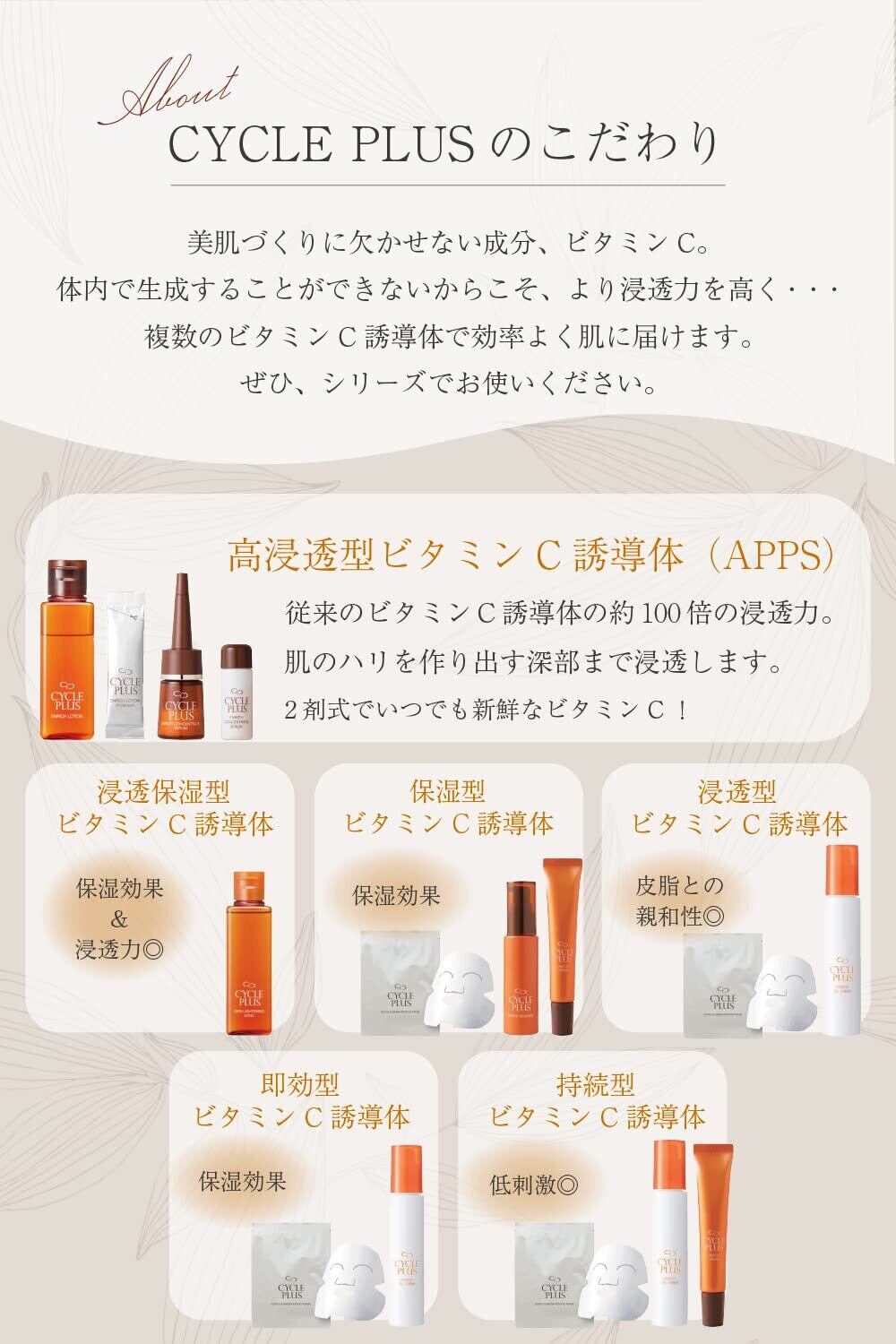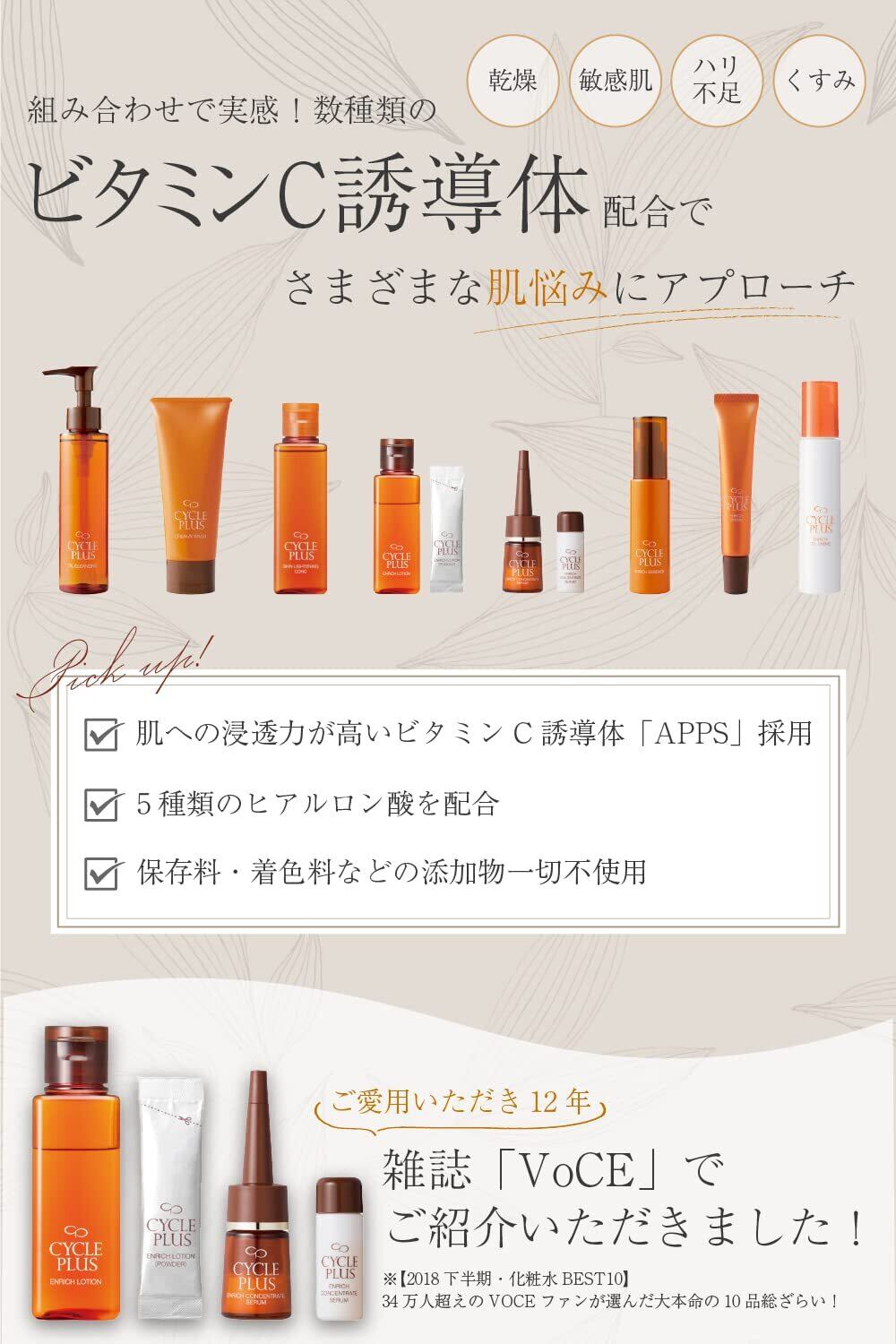 【効果】様々な肌悩みに応えられるスキンケアを提供したいという思いで開発されたサイクルプラス。贅沢に配合された美容成分が肌に多角的にアプローチし、潤い・ハリ・透明感を与えます。
