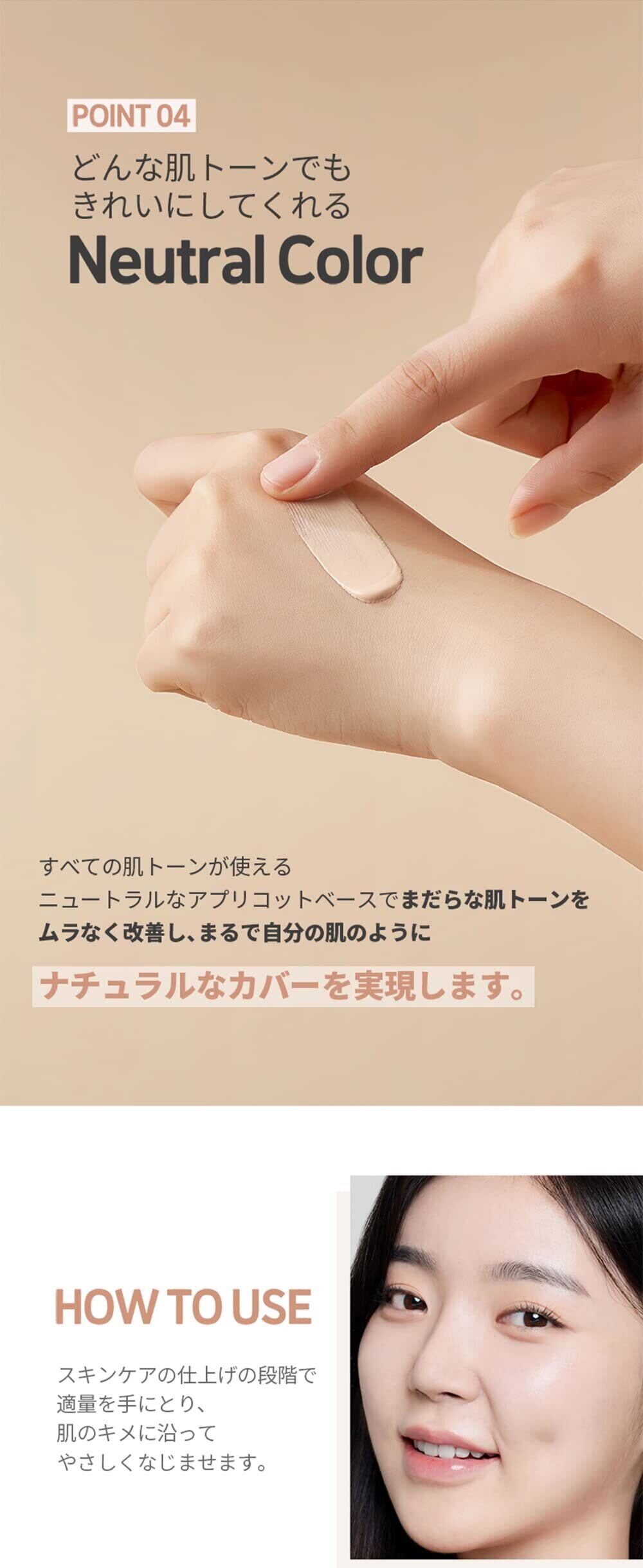 ニュートラルなアプリコットベースでまだらな肌トーンをムラなく改善します。