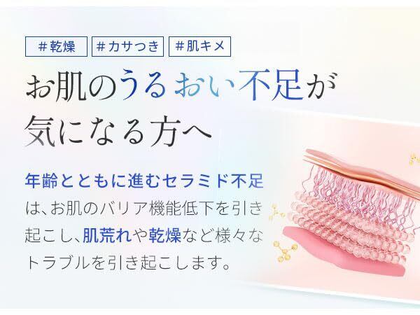 【乾燥を和らげみずみずしい肌へ】ヒト型セラミド原液※15%高濃度配合 セラミド※には様々な種類があり、その中でも貴重で効果が高い「ヒト型セラミド※」が5種類配合されています。※保湿成分
