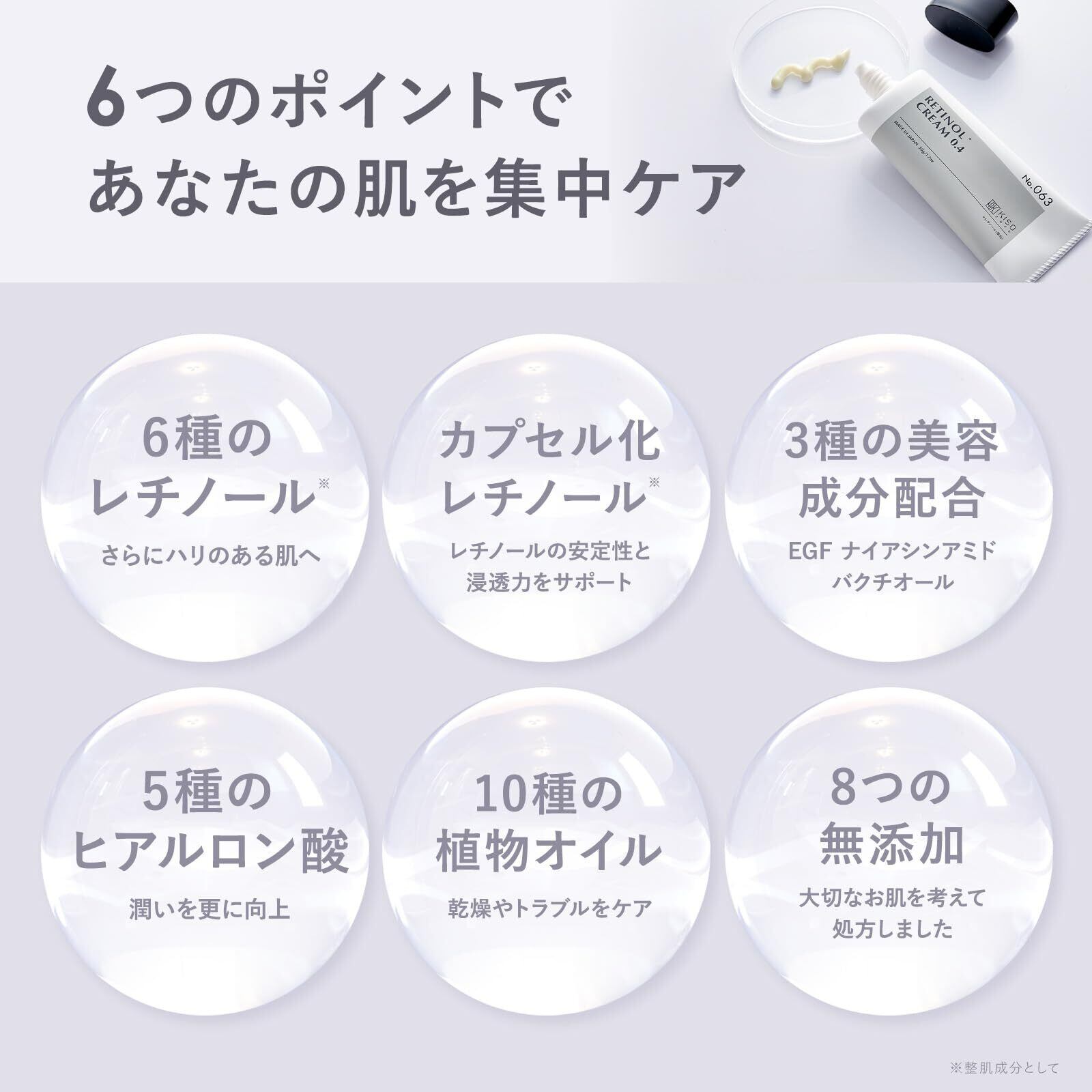 商品特長 「6つのレチノール配合でさらにハリのある肌へ」、「3種の美容成分を配合(EGF・ナイアシンアミド・バクチオール)」