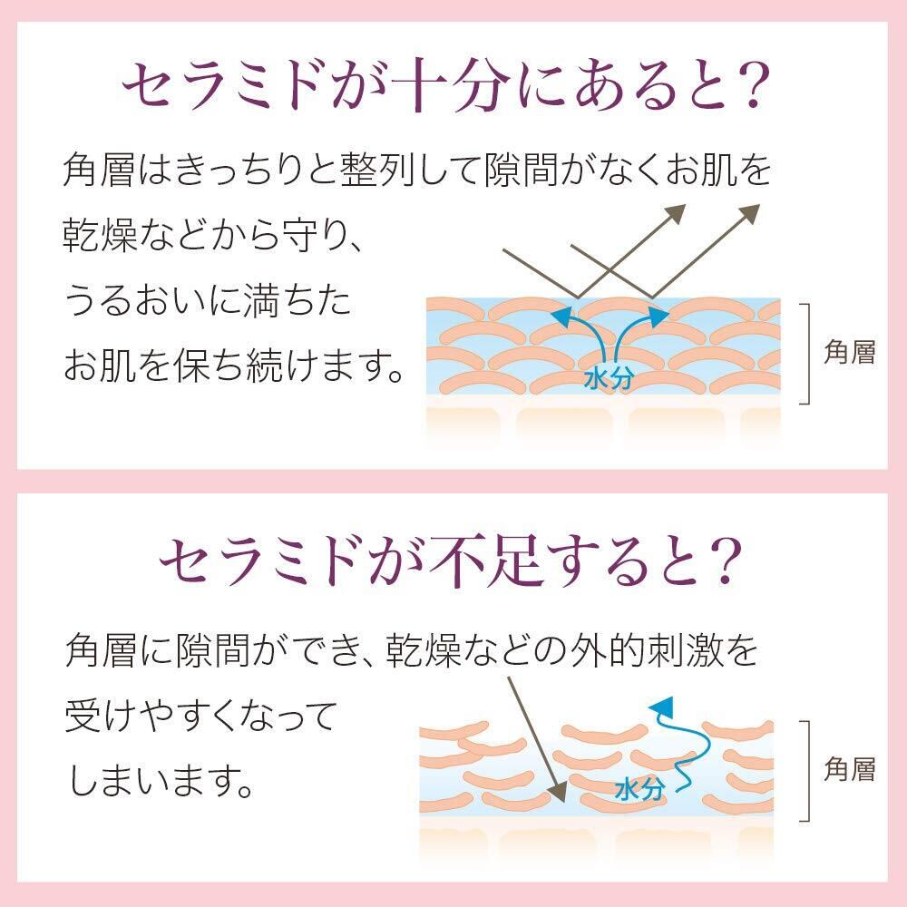 お肌に存在しているものと同質の7種類のセラミド<1.2.3.3A.3B.6II.9>(うるおい保護成分)とグルコシルセラミド、植物由来成分*(保湿成分)を配合。