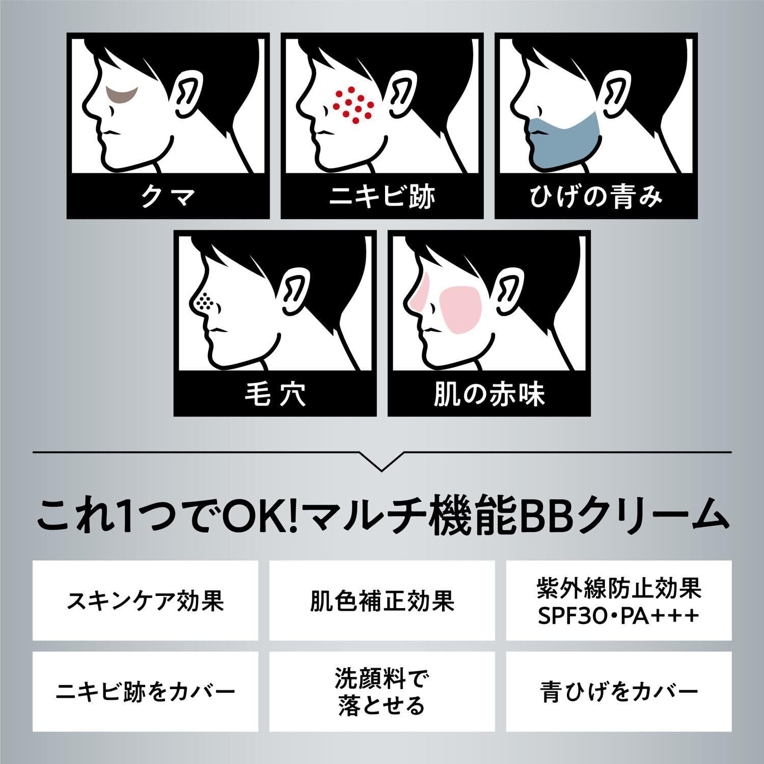 肌色・質感を簡単に補正できる男性用BBクリーム。美容液配合でみずみずしい使用感でなじみがよく、明るくツヤ感のある健康的な仕上がりに。