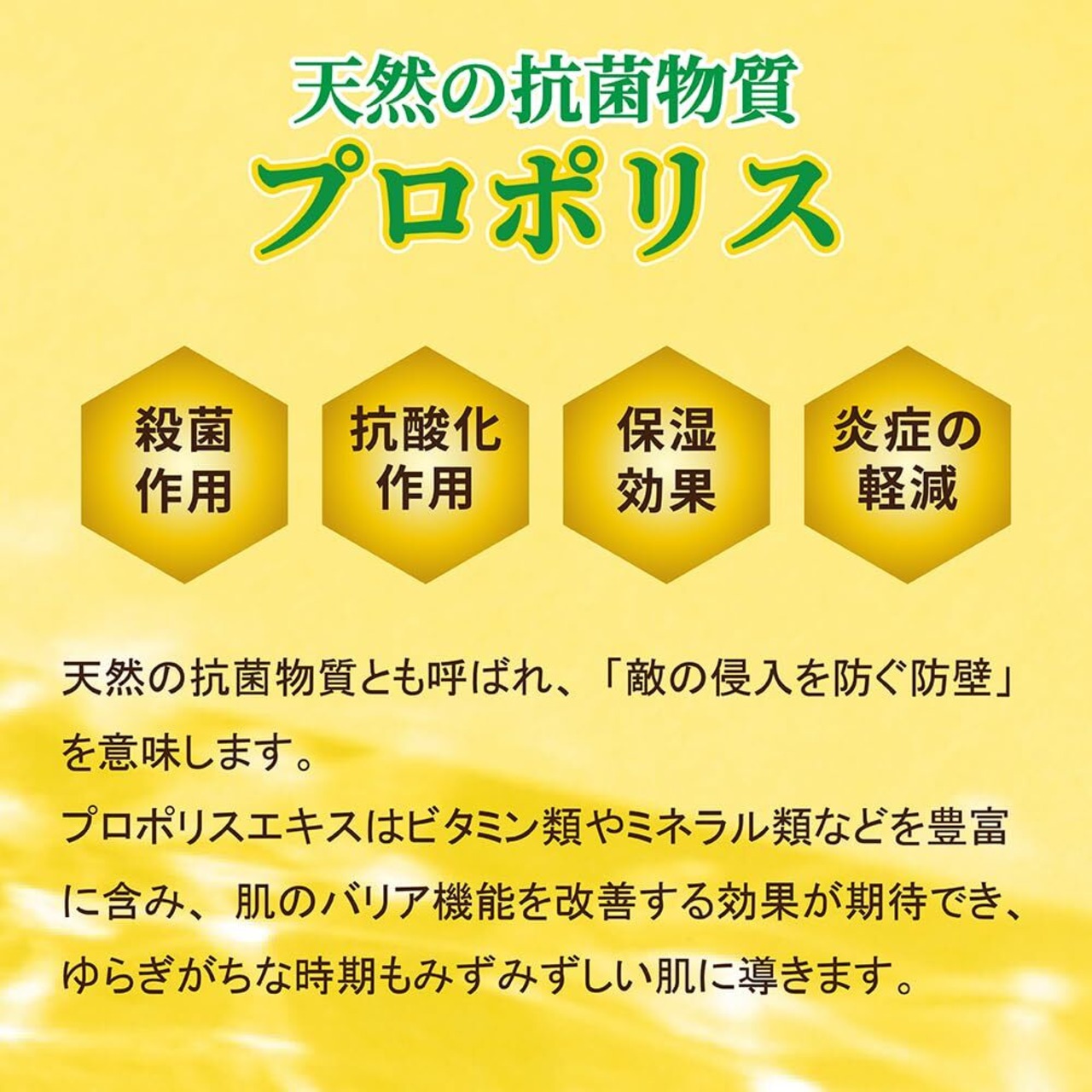 プロポリスエキス配合。ベタつき残らずうるおいツヤのある肌へと導きます。