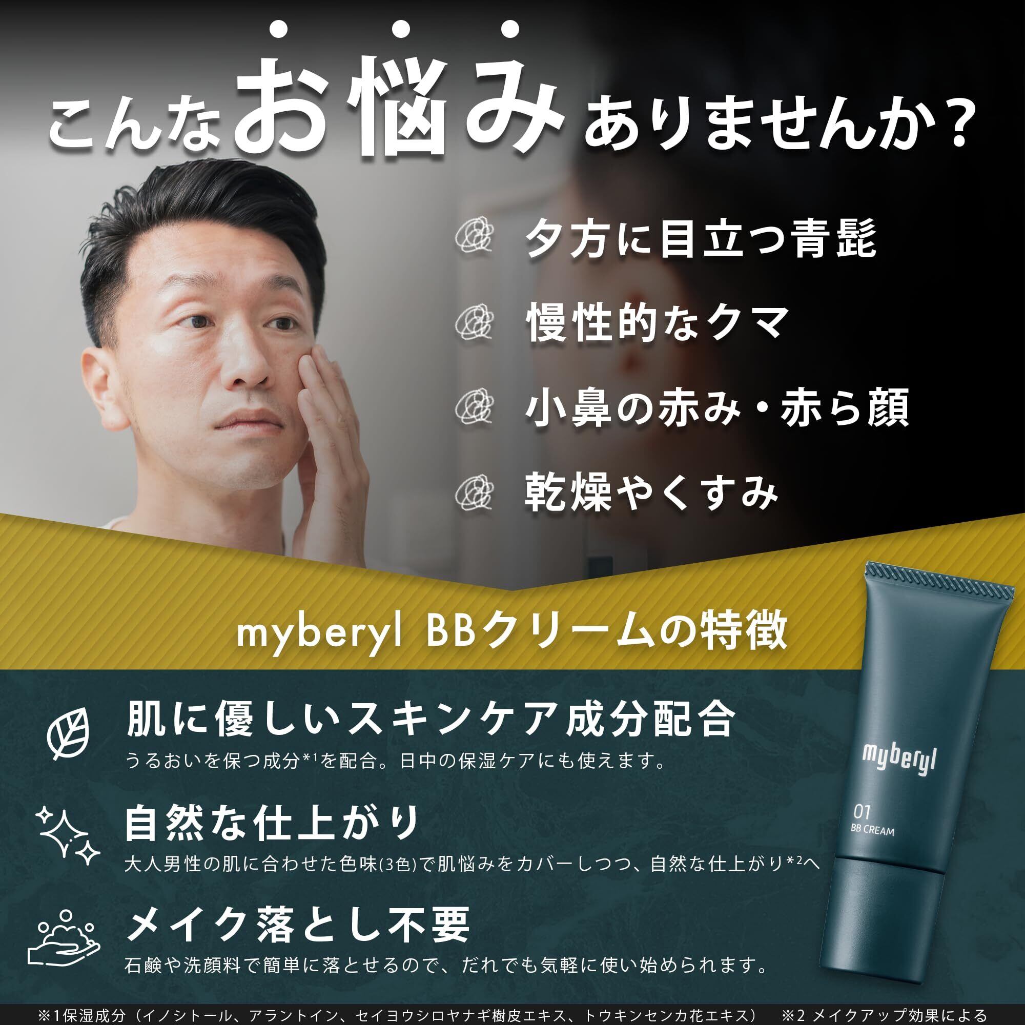 【大人男性の身だしなみメイク】BBクリームは、美容液や化粧下地、ファンデーションが一体になったアイテムで、大人男性特有の肌悩みである「寝不足によるクマ」「青ヒゲ」「毛穴やニキビなどの肌トラブル」「加齢に伴ってできたシミ」などをナチュラルにカバー※できるよう、処方にこだわっています。※メイクアップ効果による