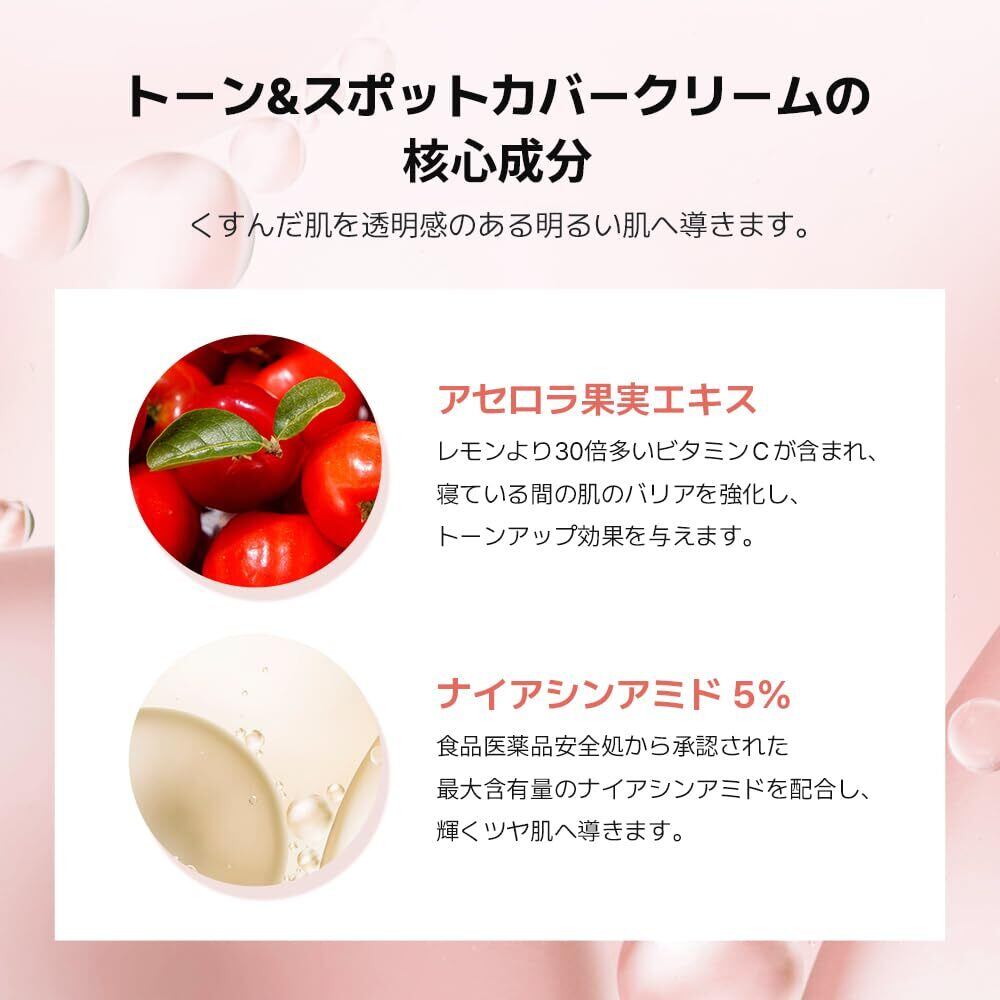 アセロラ+ナイアシンアミドの成分が肌に透明感とツヤ感を与え、寝ている間に肌のトーンを集中ケアする睡眠トーンケアクリーム。