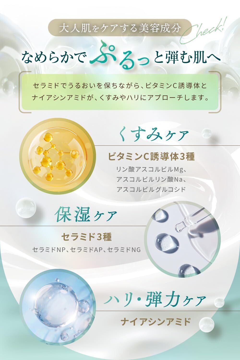 【大人肌をケアする美容成分】3種のビタミンC誘導体、ナイアシンアミド、3種のセラミドを配合。うるおいを保ちながら、くすみやハリにアプローチ。