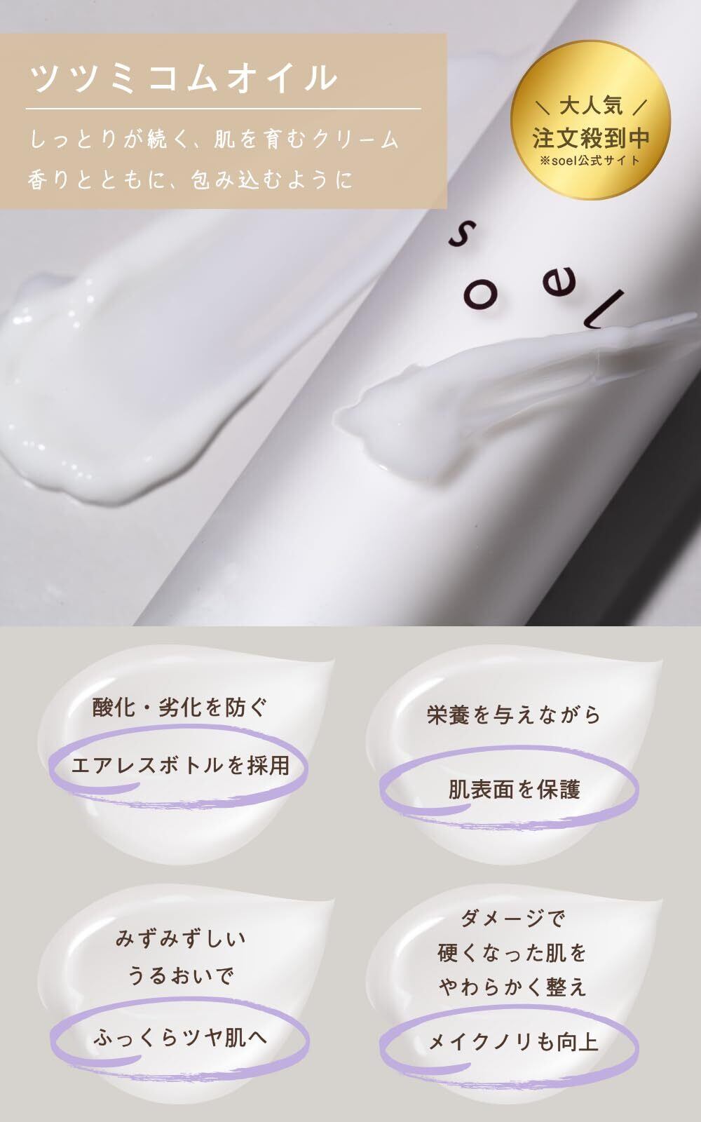【商品説明】 ツツミコムオイル。soelのクリームは、酸化・劣化を防ぐエアレスボトルを採用。高品質なオーガニックアルガンを贅沢に配合し、キングセサミ*とも相性抜群。しっかりと栄養を与えながら肌表面を保護し、みずみずしい潤いで包み込み、ふっくらツヤ肌へと導きます。20種類もの植物オイル・エキスを配合し、化粧水や美容液の潤いを逃がさずキープ。乾燥や紫外線で硬くなった肌をやわらかく整え、メイクノリも向上。ハリと弾力のある肌に仕上げます。グリーンティーの優雅な香りに包まれながら、明日の肌も育むように贅沢なスキンケアをお楽しみいただけます。 ※原生ゴマ 【内容量】50g 【サイズ】H170mmxW40mmxD40mm 【使用方法】 *エアレスボトル採用 朝晩のスキンケアの最後に使用します。 キャップを回転させ、中からポンプを出します。 適量(500円玉程度)を手にとり、顔全体にやさしくなじませ、しっかりと浸透させます。 乾燥肌の方は3~4回重ねづけをおすすめします。 ※クリーム使用後にさらにsoelのブースターオイルの使用も推奨しています。 【使用上の注意】 1.肌に異常が生じていないかよく注意して使用してください。化粧品が肌に合わないとき即ち次のような場合には、使用を中止してください。そのまま化粧品類の使用を続けますと、症状を悪化させることがありますので、皮膚科専門医等にご相談されることをおすすめします。 (1)使用中、赤み、はれ、かゆみ、刺激、色抜け(白斑等)や黒ずみ等の異常があらわれた場合 (2)使用した肌に、直射日光があたって上記のような異常があらわれた場合 2.傷やはれもの、しっしん等、異常のある部位にはお使いにならないでください。 【保存方法】 直射日光、高温多湿な場所を避けて保管してください。 【原材料】水、ゴマ種子油、グリセリン、プロパンジオール、アルガニアスピノサ核油、スクワラン、マカデミア種子油、ホホバ種子油、オリーブ果実油、カニナバラ果実油、ワイルドタイムエキス、セイヨウシロヤナギ樹皮エキス、アーチチョーク葉エキス、ヒメフウロエキス、クダモノトケイソウ果実エキス、ビルベリー葉エキス、ベルガモット果実油、エンピツビャクシン油、ローズウッド木油、シロバナインドソケイ花エキス、ニンジン種子油、アンゼリカ根油、ミリスチン酸ポリグリセリル-10、キサンタンガム、トコフェロール、BG、カルボマー、水酸化K、ペンチレングリコール、1,2-ヘキサンジオール、カプリリルグリコール、エチルヘキシルグリセリン