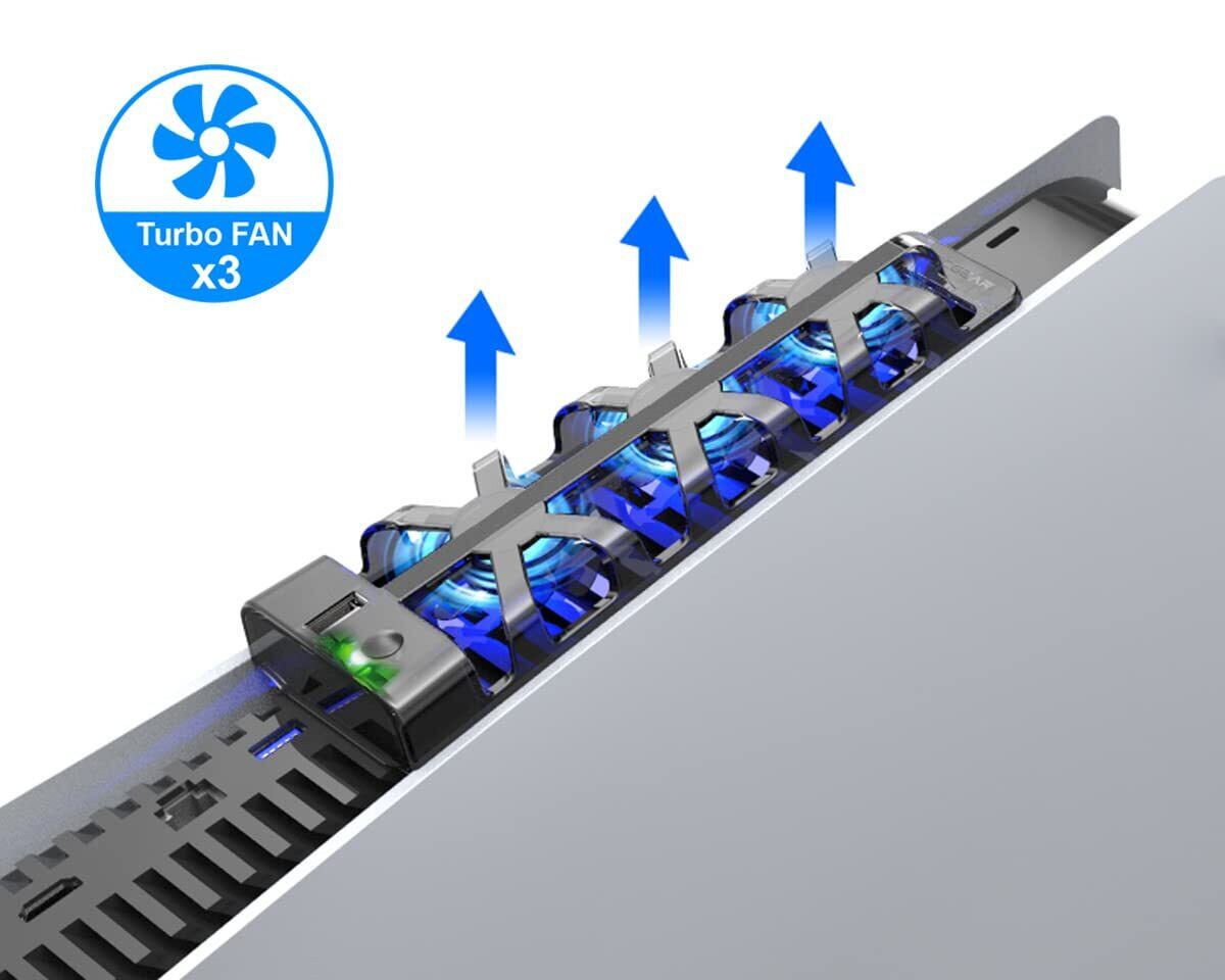 [3xターボファン] – 2台直径37mmの小型ファンが5400RPMで回転し、1台45mmのファンが4800RPMで±10%の許容範囲内で回転します。一緒にそれらは空気循環を加速し、PS5から熱気を吸い出します。一方、青色のLEDライトは、透明なブレードが急速に回転しているときに点灯します