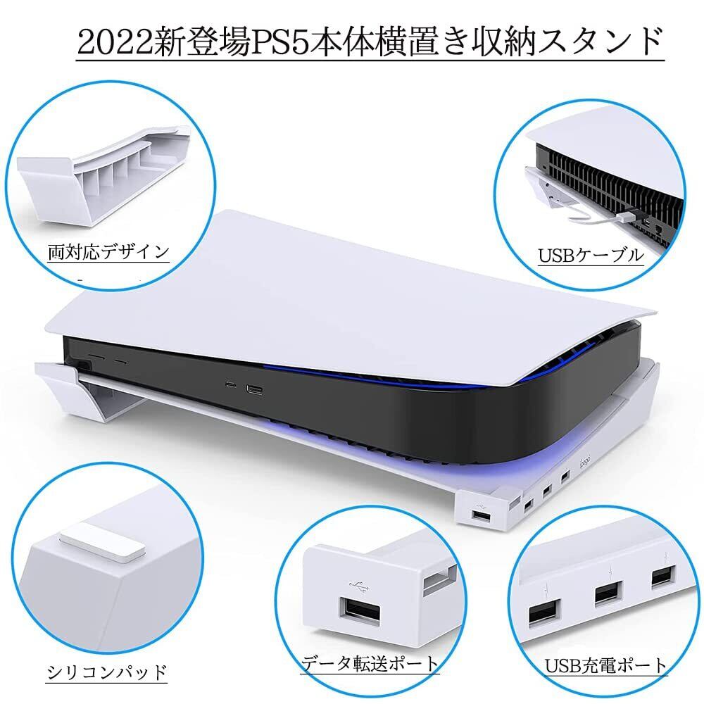 2022年 PS5本体用 横置き収納スタンド 4つのUSBポート付き 転倒防止 地震対策 傷付き防止 放熱改善 PS5通常版とデジタル版両対応 日本語説明書付き(ホワイト)