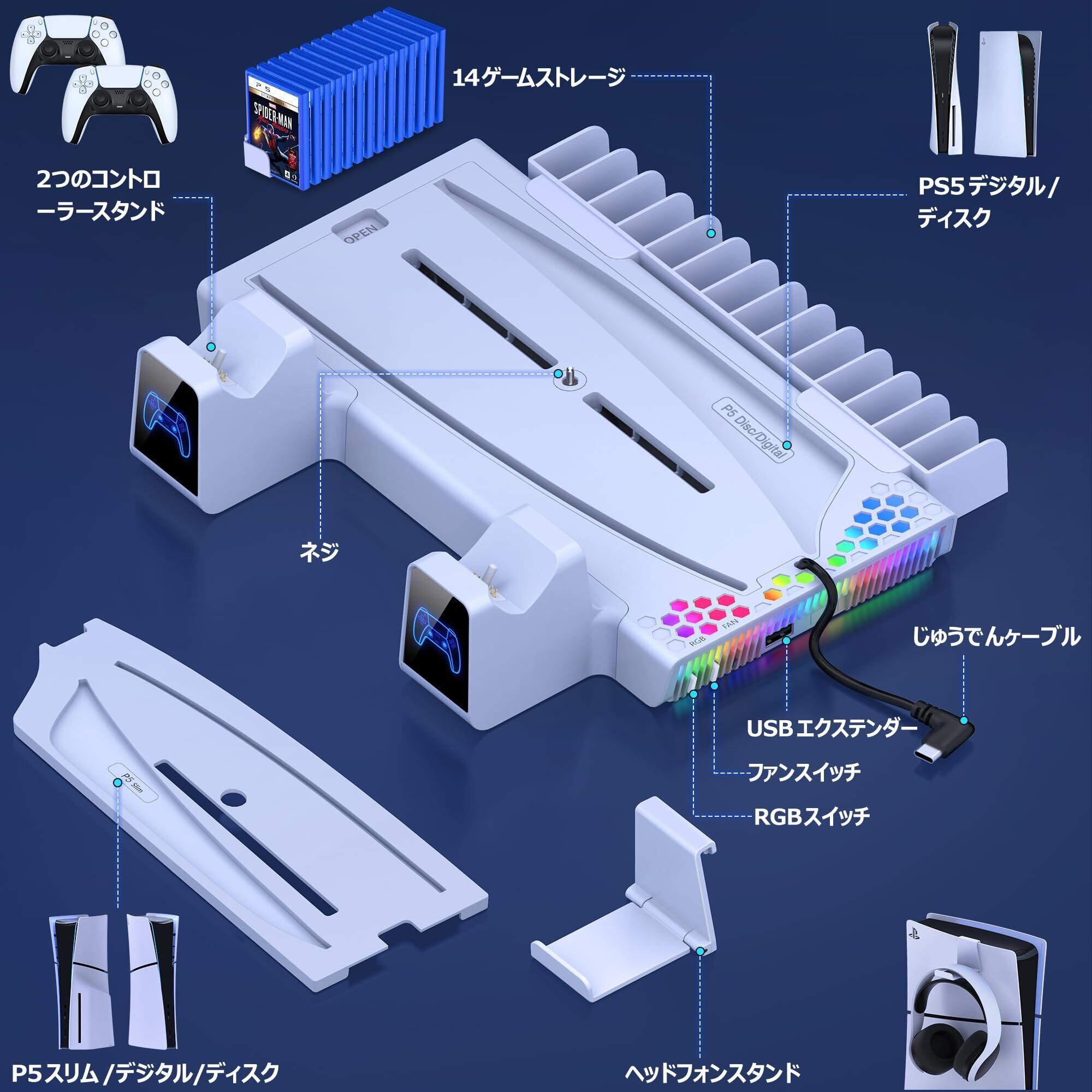 ps5 slim スタンド 縦置き 冷却ファン付き放熱 PS5/PS5 Silm コントローラー 充電スタンド 2台同時充電 新型ps5 3段階風速調整可能 RGBライトPS5 Silm/PS5用アクセサリー