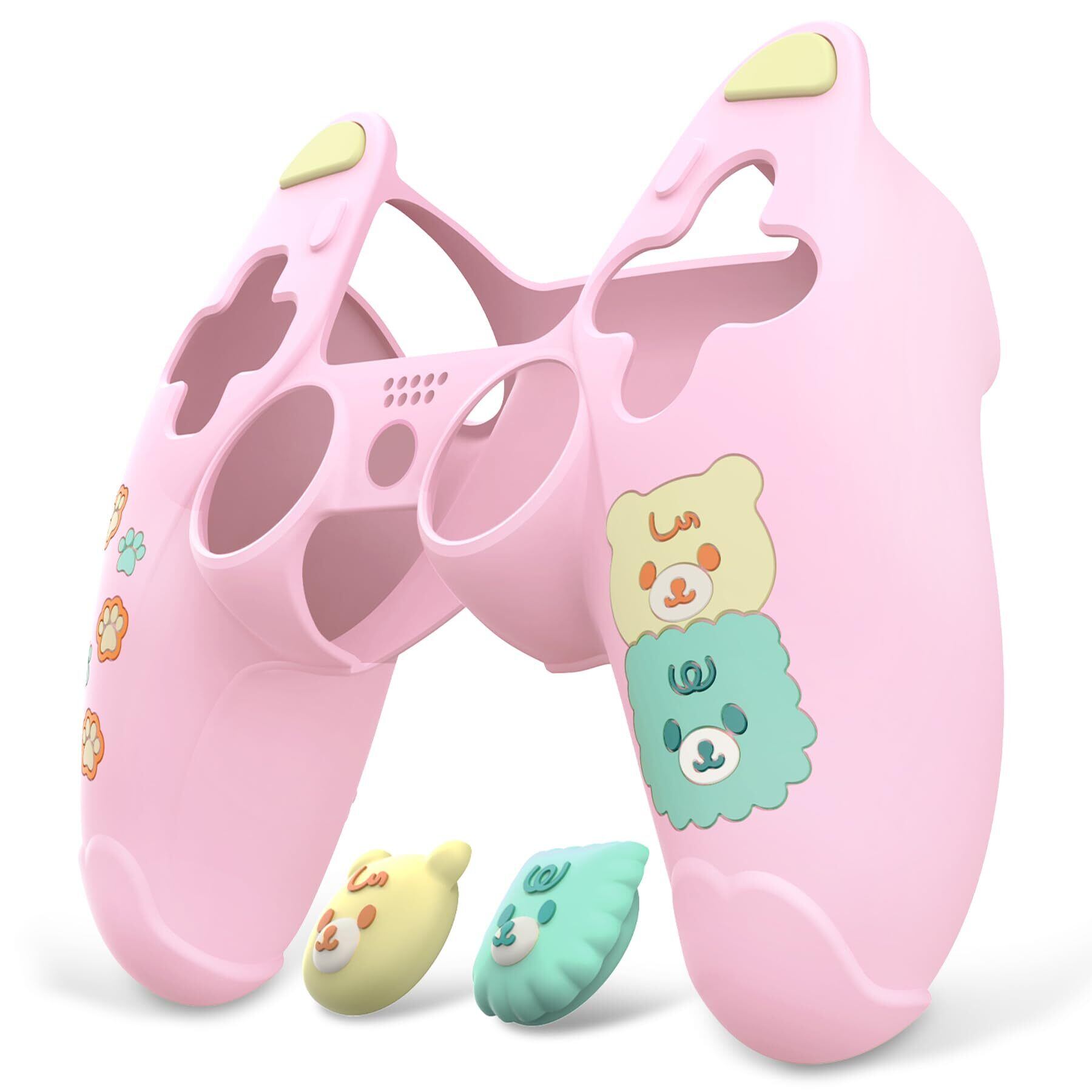 PlayVital ps5コントローラーに対応用シリコンカバー、可愛いクマスタイルカバー付けたまま充電ステーションにも対応し、サムスティックキャップカバー&タッチパッドシール付属しています【ピンク&イエロー】