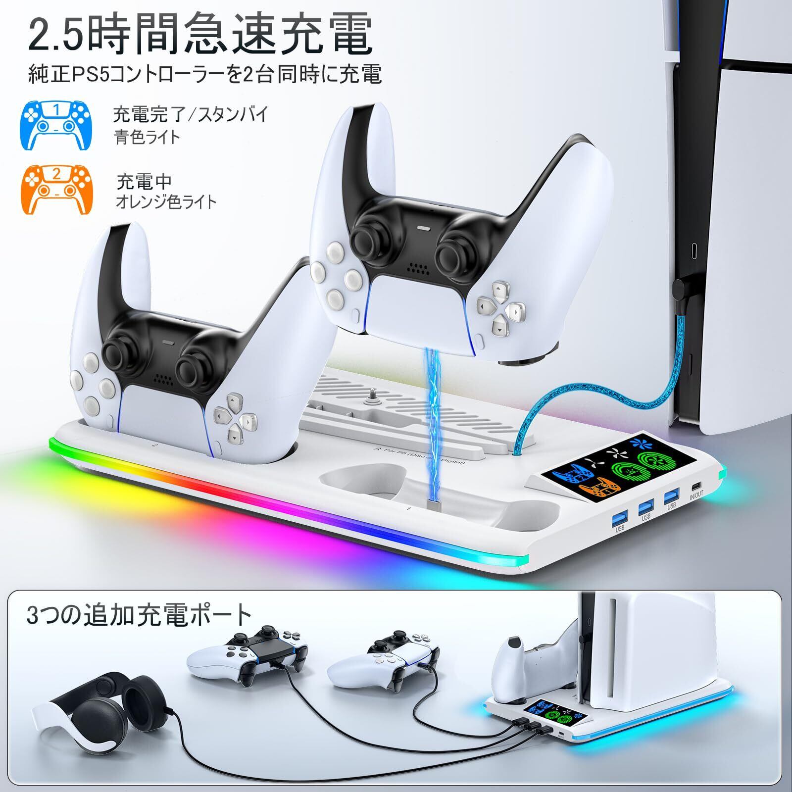 【新旧型PS5両対応 PS5 Pro非対応】新型 PS5 Slim 縦置き 冷却 スタンド 3段階風速調整 PS5 コントローラー 充電器 2台同時充電 充電指示ランプ付 モード選択可能RGBライト プレステ5/PS5スリム通常版とデジタル版両対応 PS5 周辺機器 ヘッドセットフック付