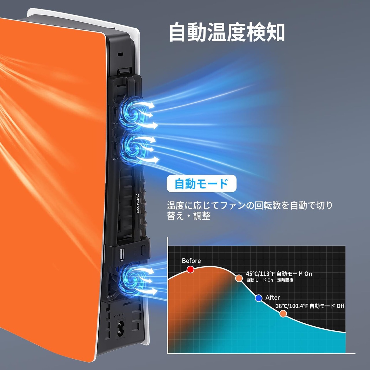 【自動温度検知】新型PS5 冷却ファンは温度に応じてファンの回転数を自動で切り替え・調整の自動モードがあります。スイッチを入れると、ファンは自動モードになります。温度が約113°F/45°C以上になると、ファンは自動的にONになります。温度が約38℃/100.4℉以下になると、ファンは自動的にOFFになります。